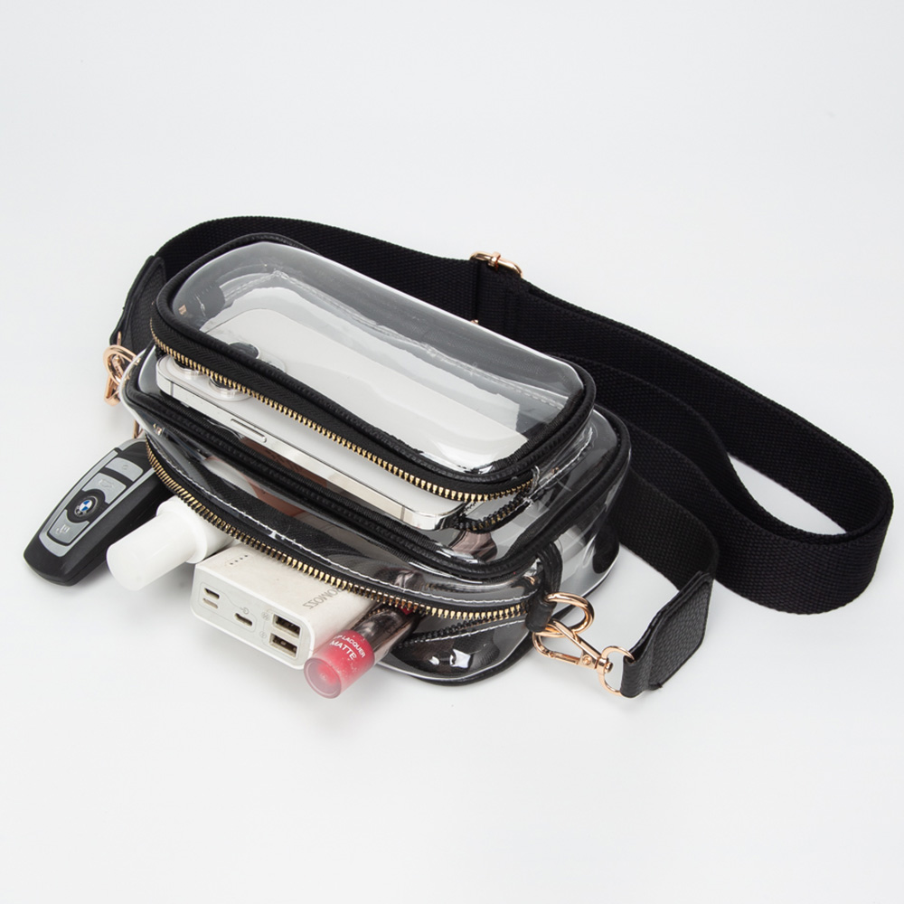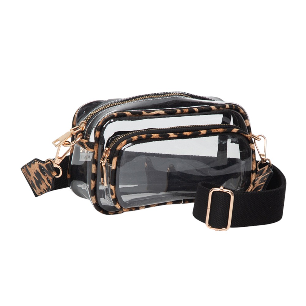 Details • Size : 8" X 5" X 3.5" • Strap Size : 53" L / Detachable, Adjustable • One Outside Zipper Pocket • Zipper Closure • Be game day ready with this clear stadium-approved crossbody bag, featuring white trim, dual zip compartments, and an adjustable strap for hands-free comfort. Perfect for concerts, sporting events, festivals, and venues with clear bag policies, offering style, security, and convenience on the go.