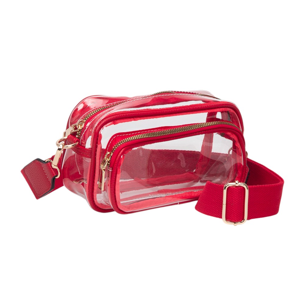 • Be game day ready with this clear stadium-approved crossbody bag, featuring white trim, dual zip compartments, and an adjustable strap for hands-free comfort. Perfect for concerts, sporting events, festivals, and venues with clear bag policies, offering style, security, and convenience on the go.