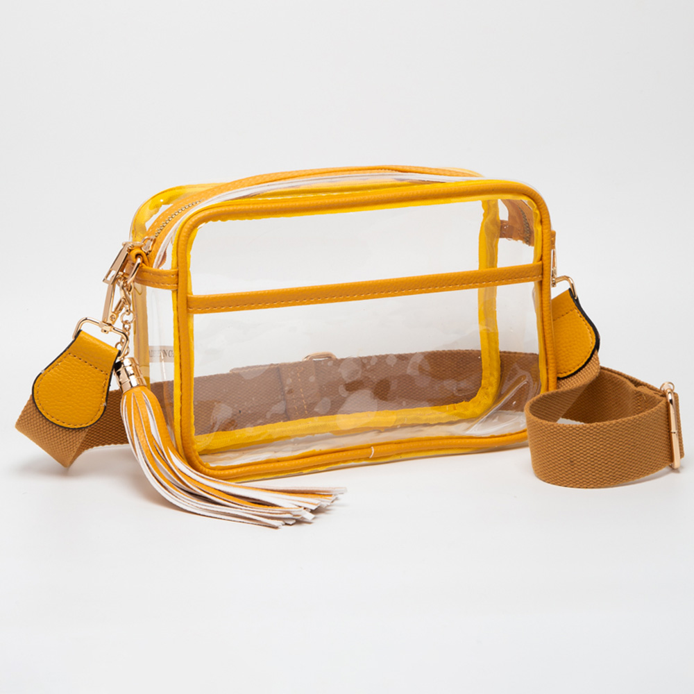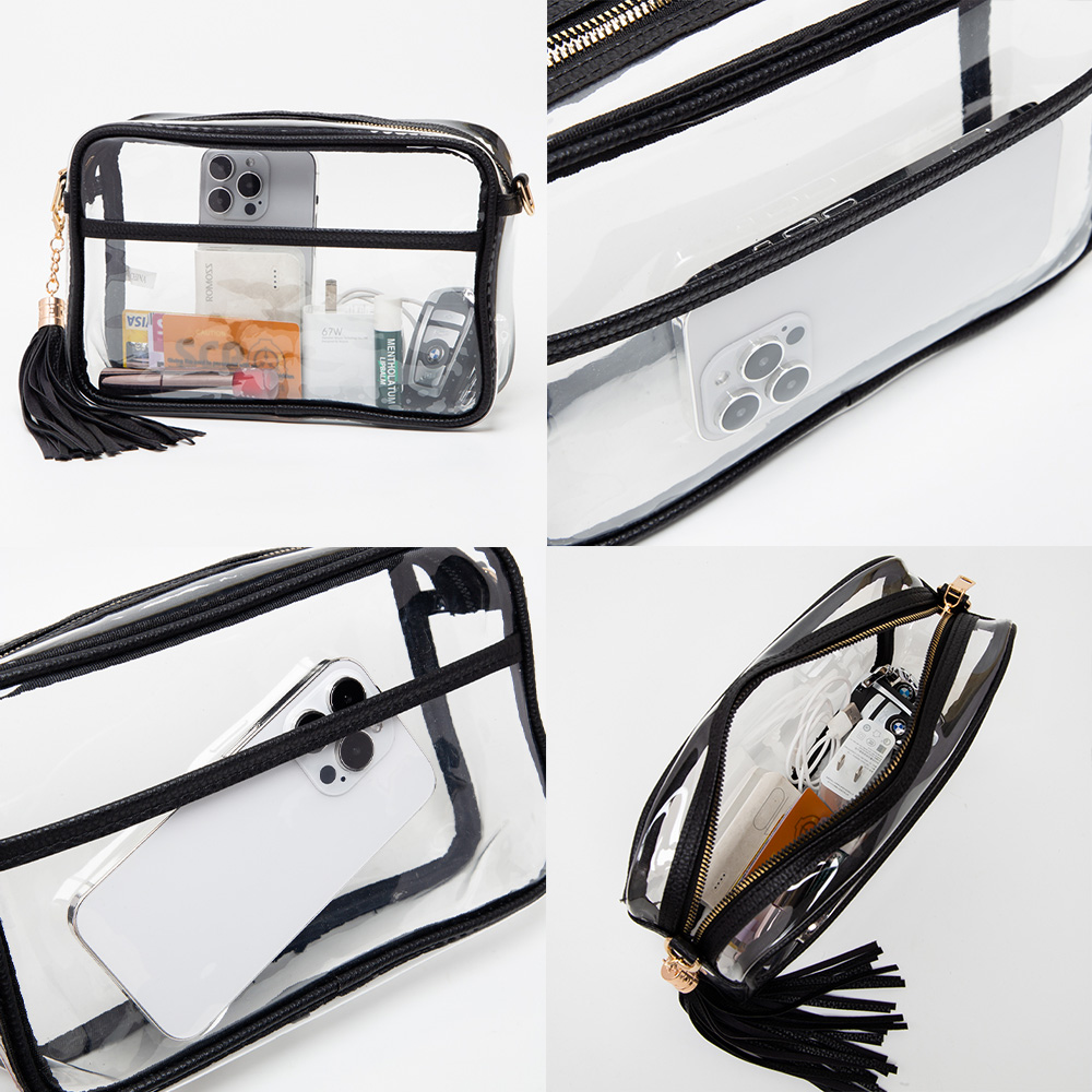 • Practical and stylish clear crossbody bag with zipper closure, tassel accent, and adjustable detachable strap for comfortable wear. Perfect for concerts, stadiums, festivals, or daily use where clear bags are required, offering secure storage and easy visibility of essentials.