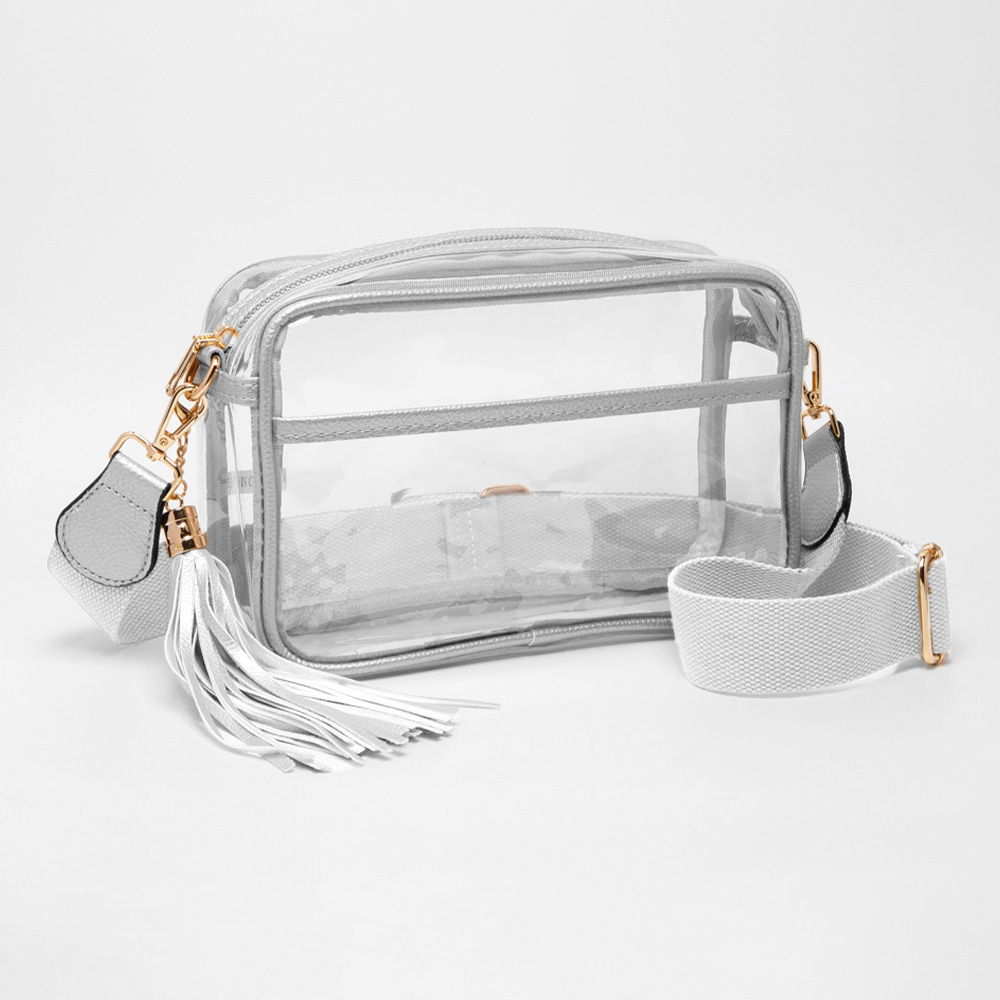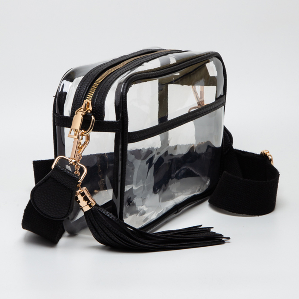 • Practical and stylish clear crossbody bag with zipper closure, tassel accent, and adjustable detachable strap for comfortable wear. Perfect for concerts, stadiums, festivals, or daily use where clear bags are required, offering secure storage and easy visibility of essentials.
