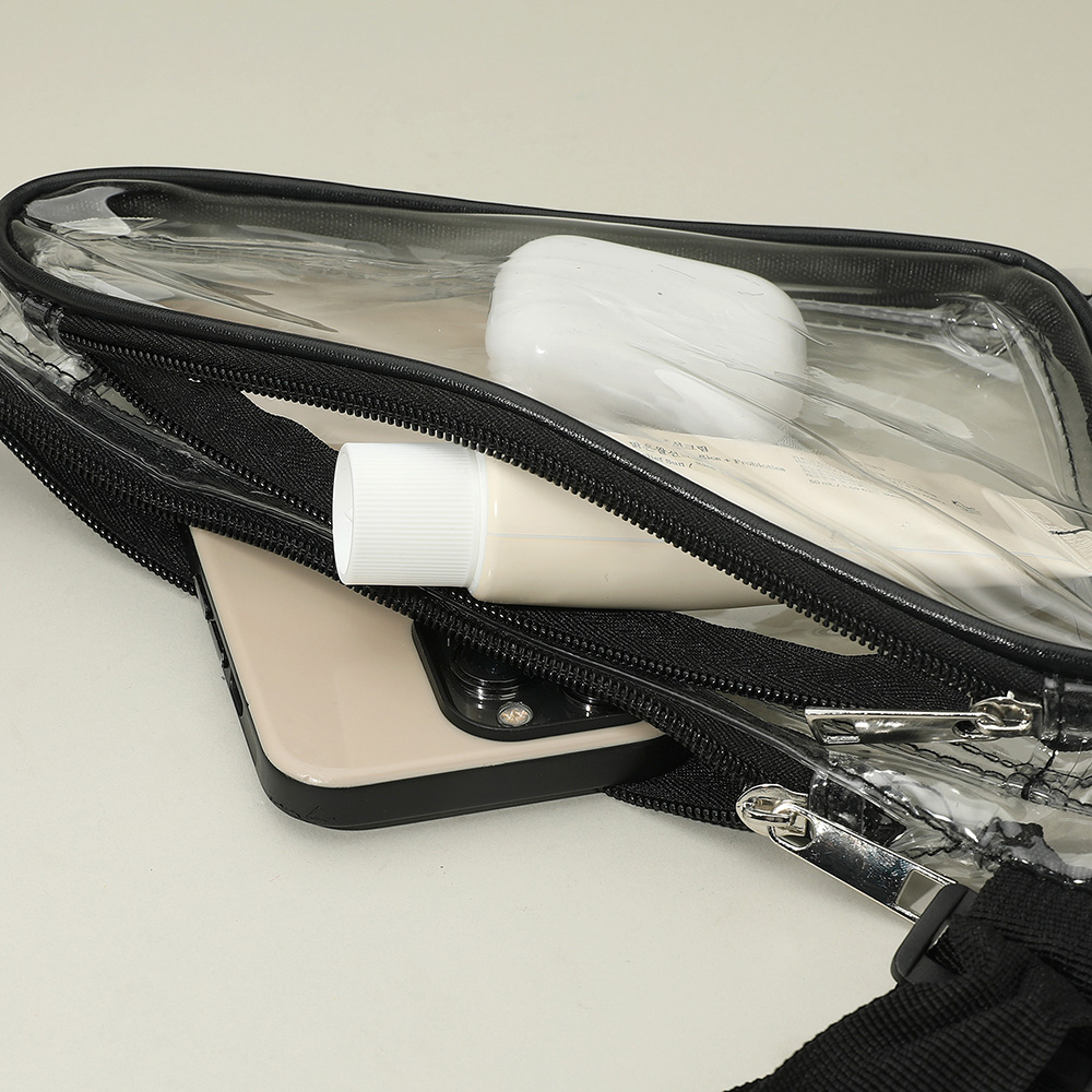 Details • Size : 12" X 6.5" X 1.75" • Adjustable Strap • Zipper Closure • This clear sling bag features a triangular design with adjustable strap and secure zip closure. Perfect for stadiums, concerts, and travel, it keeps your essentials visible and organized while meeting security requirements.