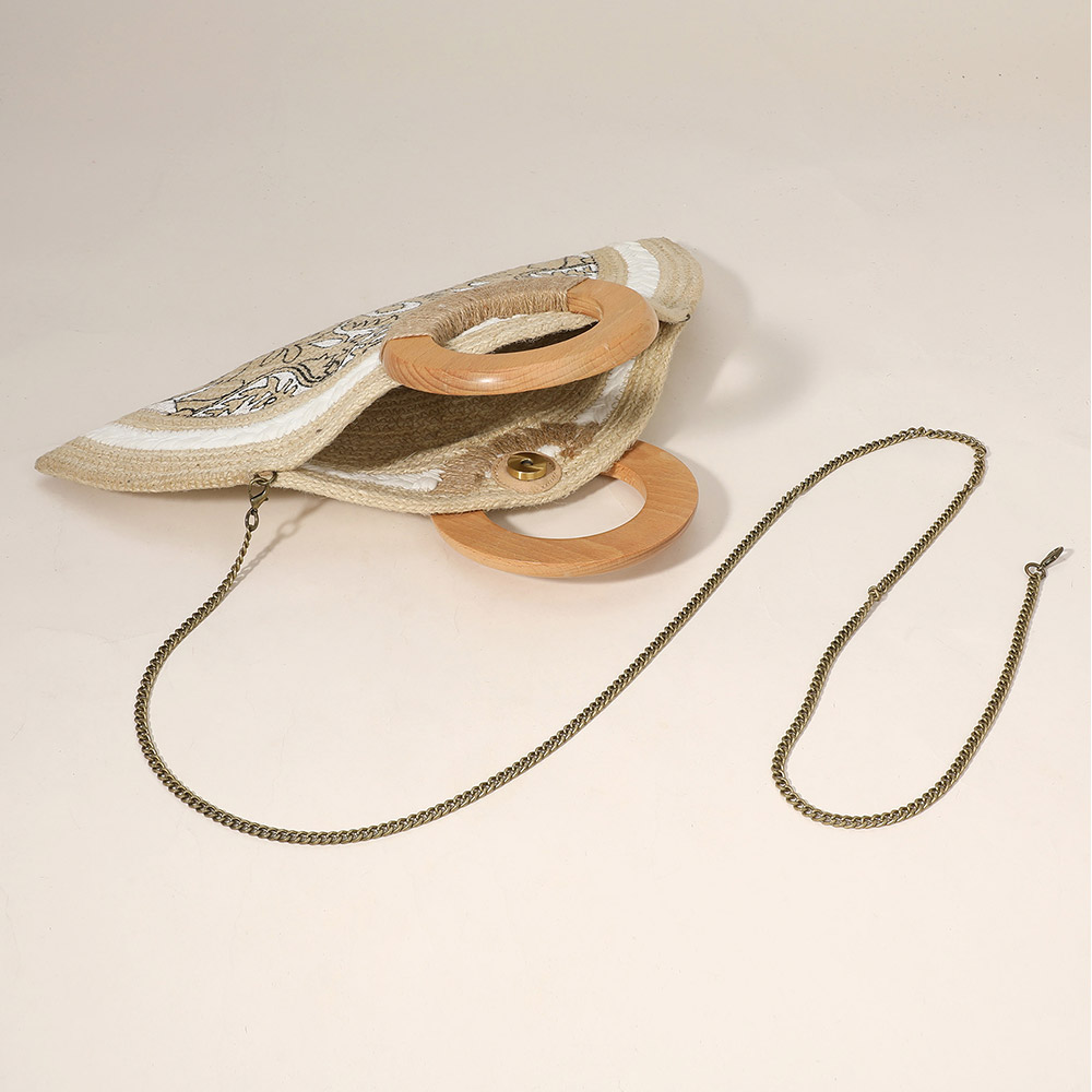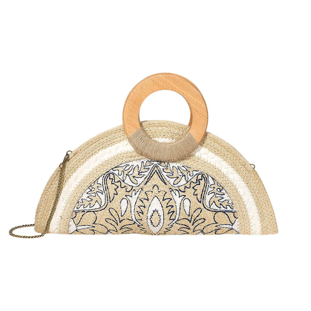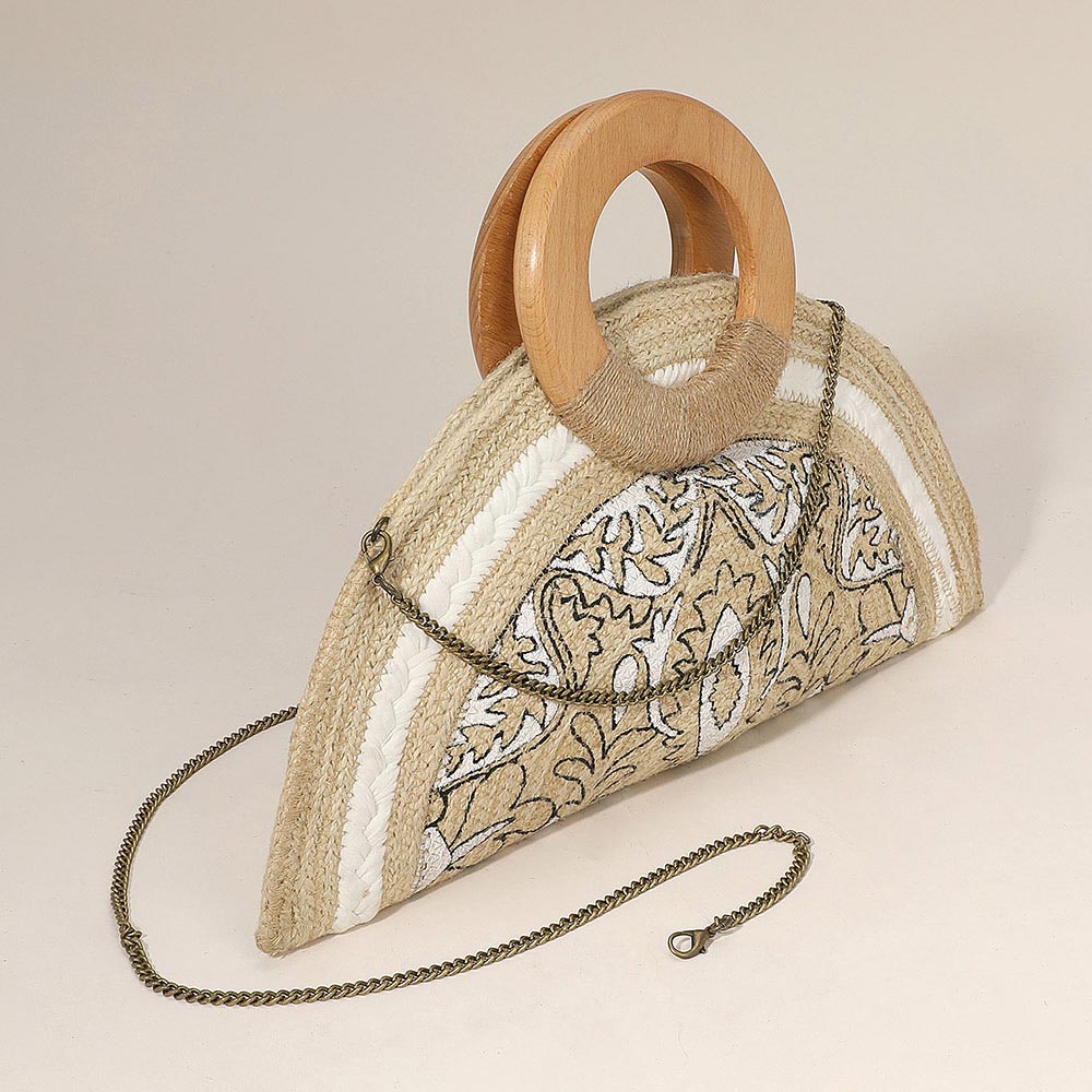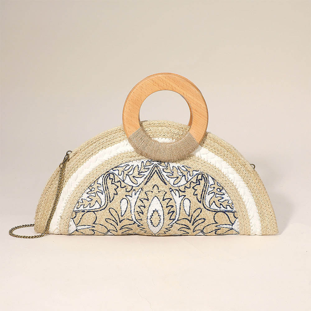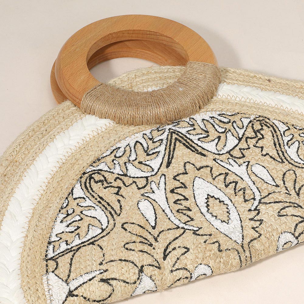 Wooden Handle Abstract Pattern Printed Handwoven Half-Moon Straw Clutch Bag / Crossbody Bag