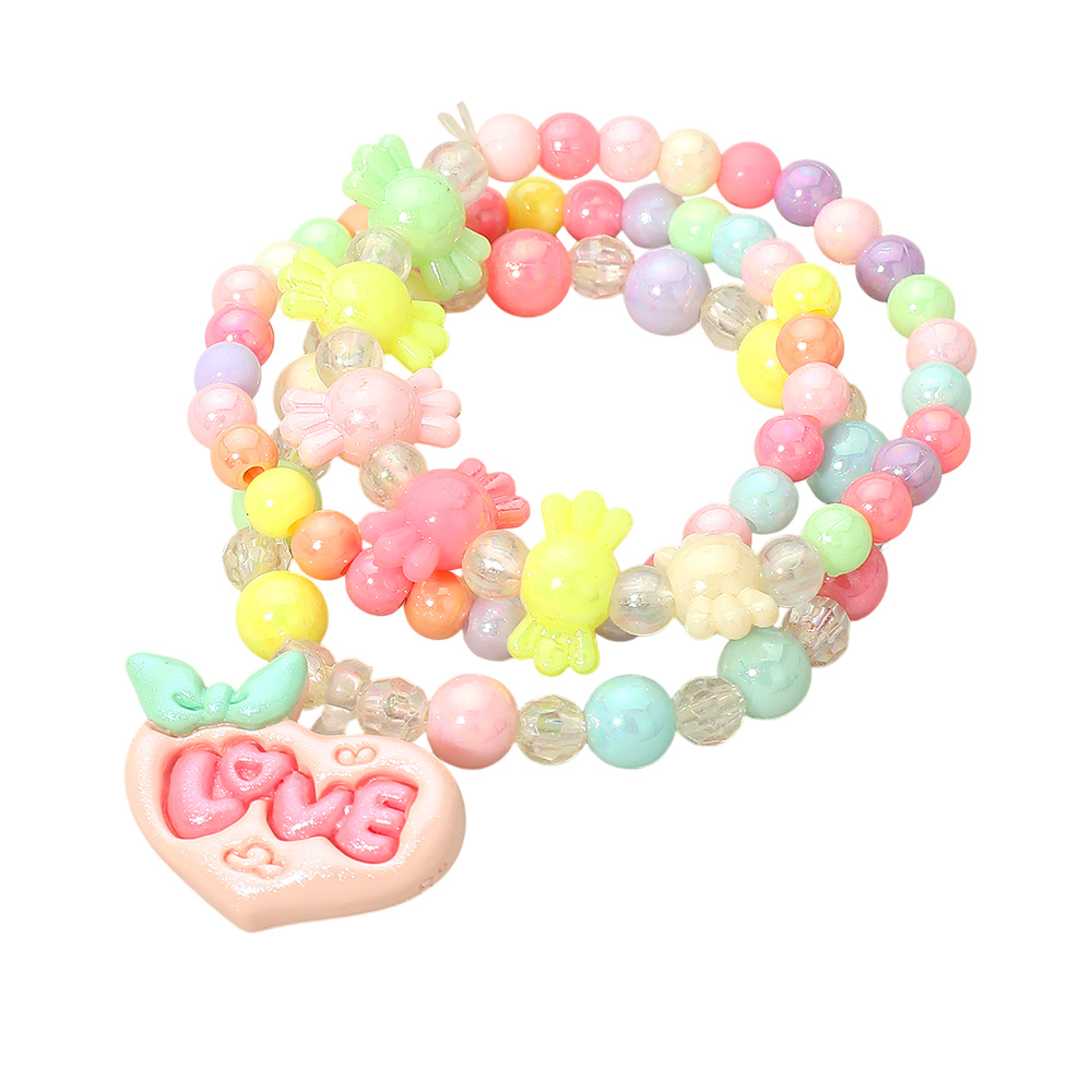 Details • Size : 1.8" H • Stretchable • Charming kids’ bracelet set featuring a love heart charm, flower bead accents, and playful stretch design. Perfect for parties, daily outfits, or gift bags, this 12-piece jewelry pack adds creativity, fun, and trendy style to children’s accessories, making it a delightful addition to any collection.