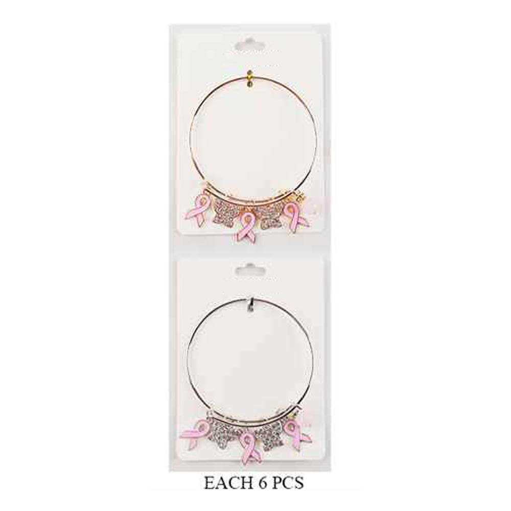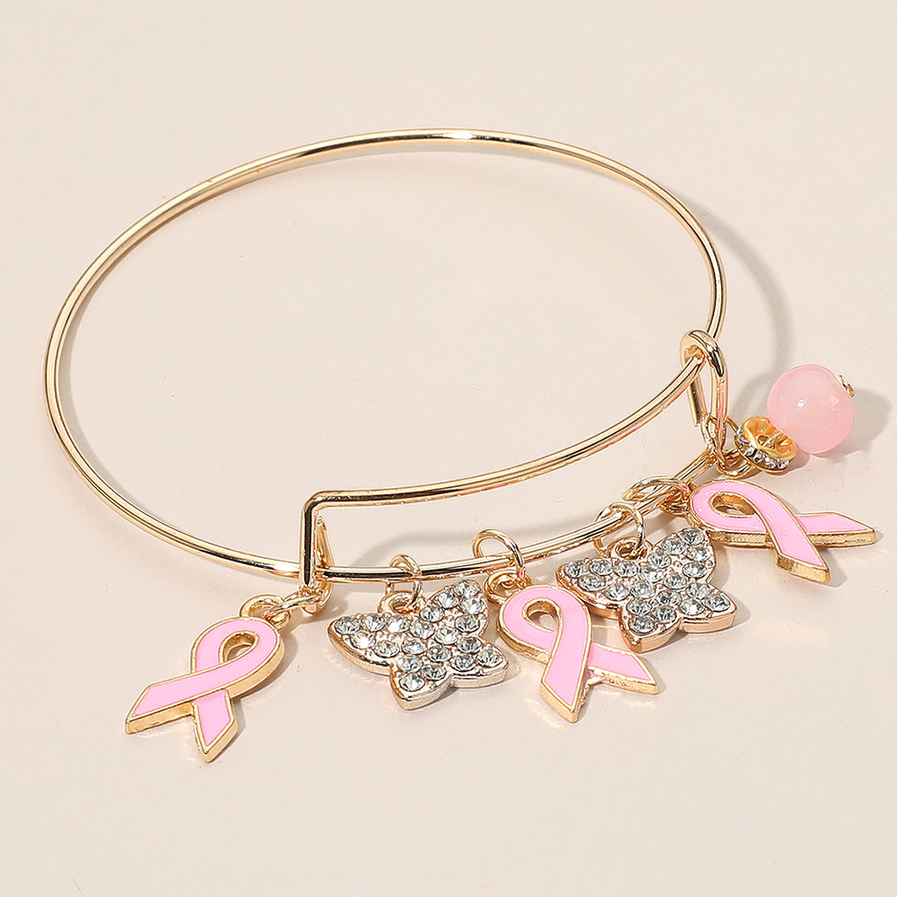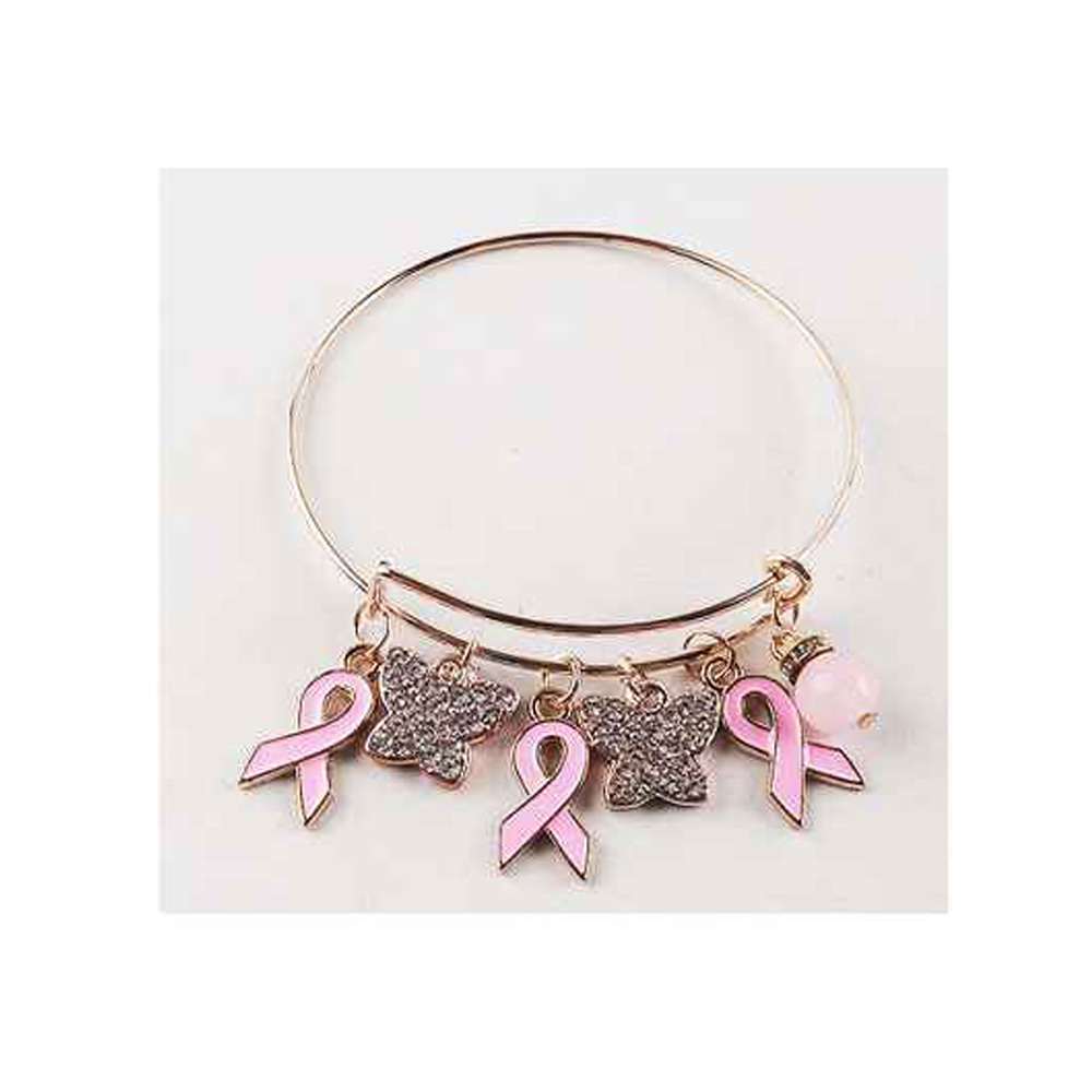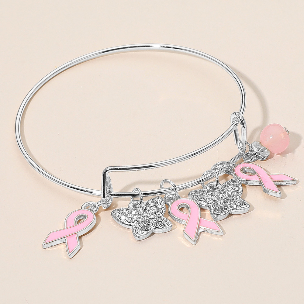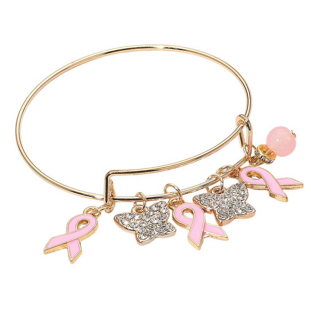 Details • Size : 0.5" H, 2.5" D • Charm Size : 1" L • Adjustable • Show support in style with this awareness ribbon charm bangle bracelet featuring pink ribbon pendants, sparkling butterflies, and a delicate bead accent. A meaningful accessory that combines elegance with purpose, perfect for daily wear or gifting with love and care. • Lead and Nickel Compliant