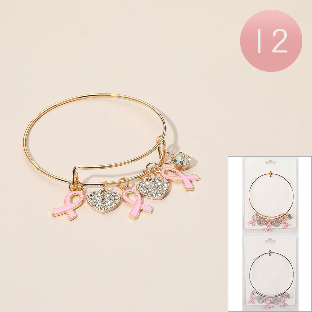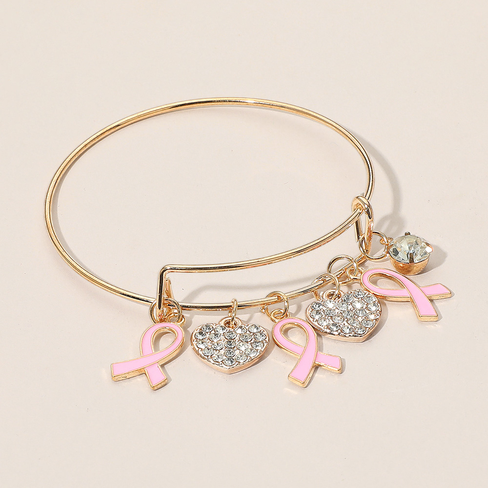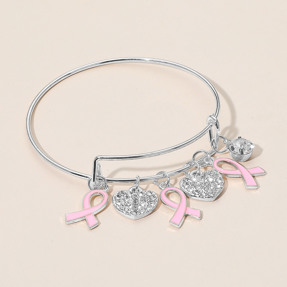 Details • Size : 0.5" H, 2.5" D • Charm Size : 1.1" L • Adjustable • Show your support with this awareness ribbon bangle bracelet featuring pink ribbon charms, sparkling crystal hearts, and a delicate gem accent. A meaningful and stylish accessory, perfect for raising awareness, daily wear, or gifting with love and encouragement. • Lead and Nickel Compliant