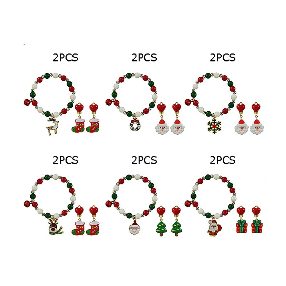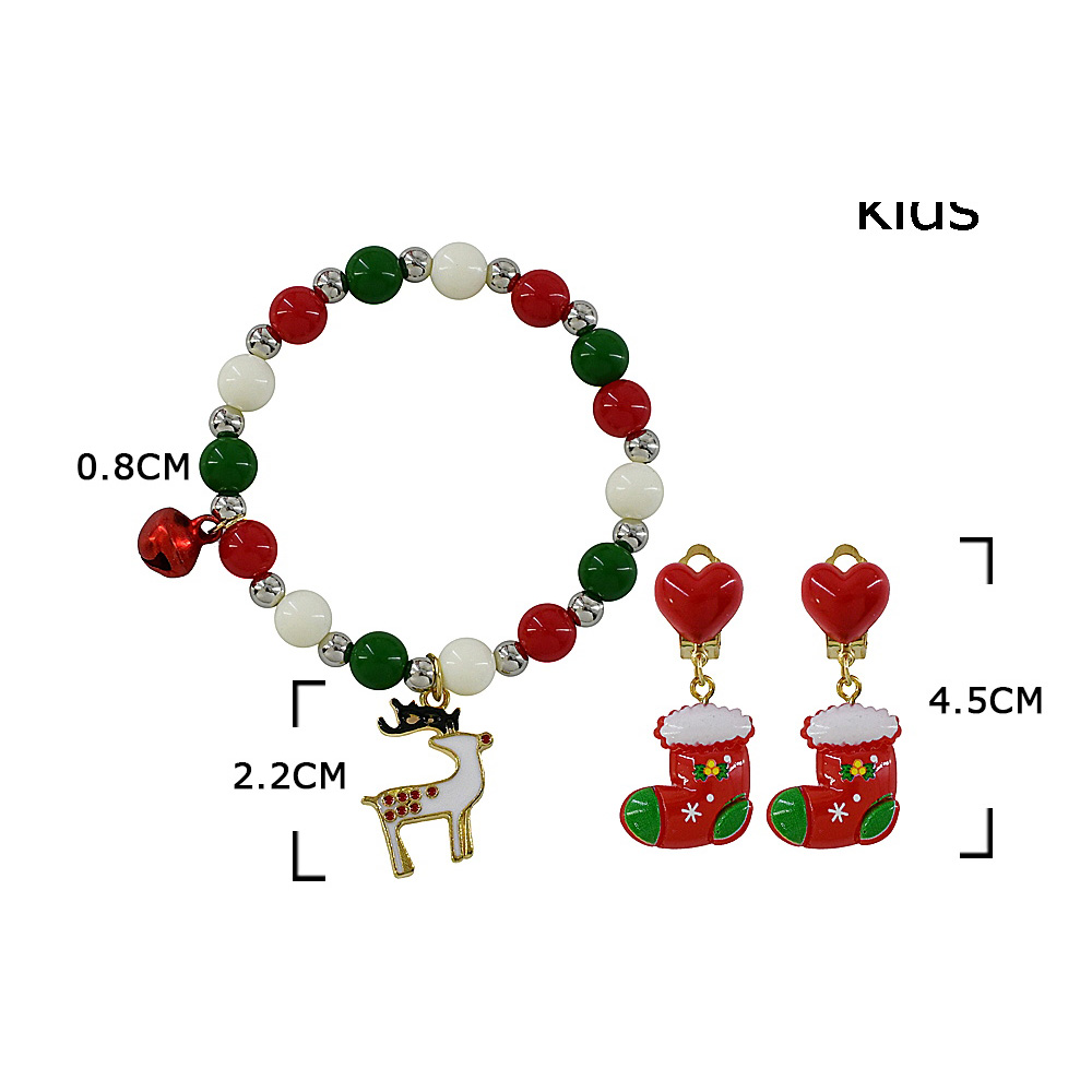 Details • Size : 0.3" H (Stretchable) • Charm Size : Approximately 1" L • Earring Size : 1.5" L (Clip On) • Celebrate the season with this festive Christmas jewelry set, featuring a beaded bracelet with reindeer charm and jingle bell, plus adorable stocking dangle earrings. A playful holiday accessory perfect for parties, gifting, and festive outfits. • Lead and Nickel Compliant