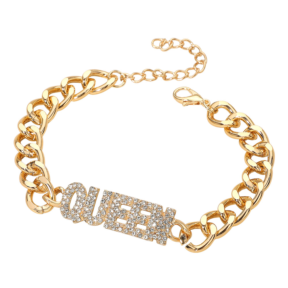 Details • Size : 0.5" H, 9.25" + 3" L • Lobster Clasp Closure • Make a confident style statement with this Queen Letter Bracelet. Featuring a chunky chain and dazzling rhinestone-studded “QUEEN” charm, it’s perfect for adding a touch of glam to any outfit. Ideal for gifting or showcasing your inner royalty with everyday elegance. • Lead and Nickel Compliant