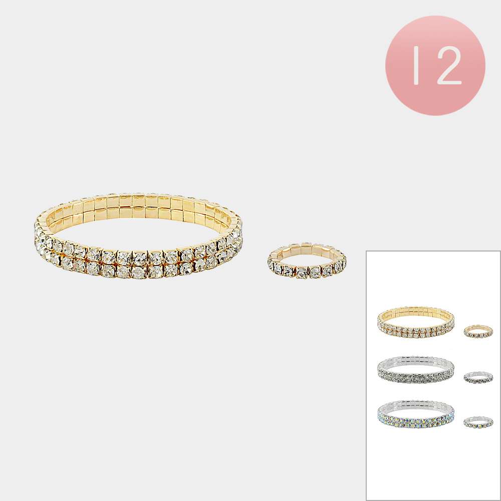 12PCS - Rhinestone Paved Stretch Bracelet Ring Set