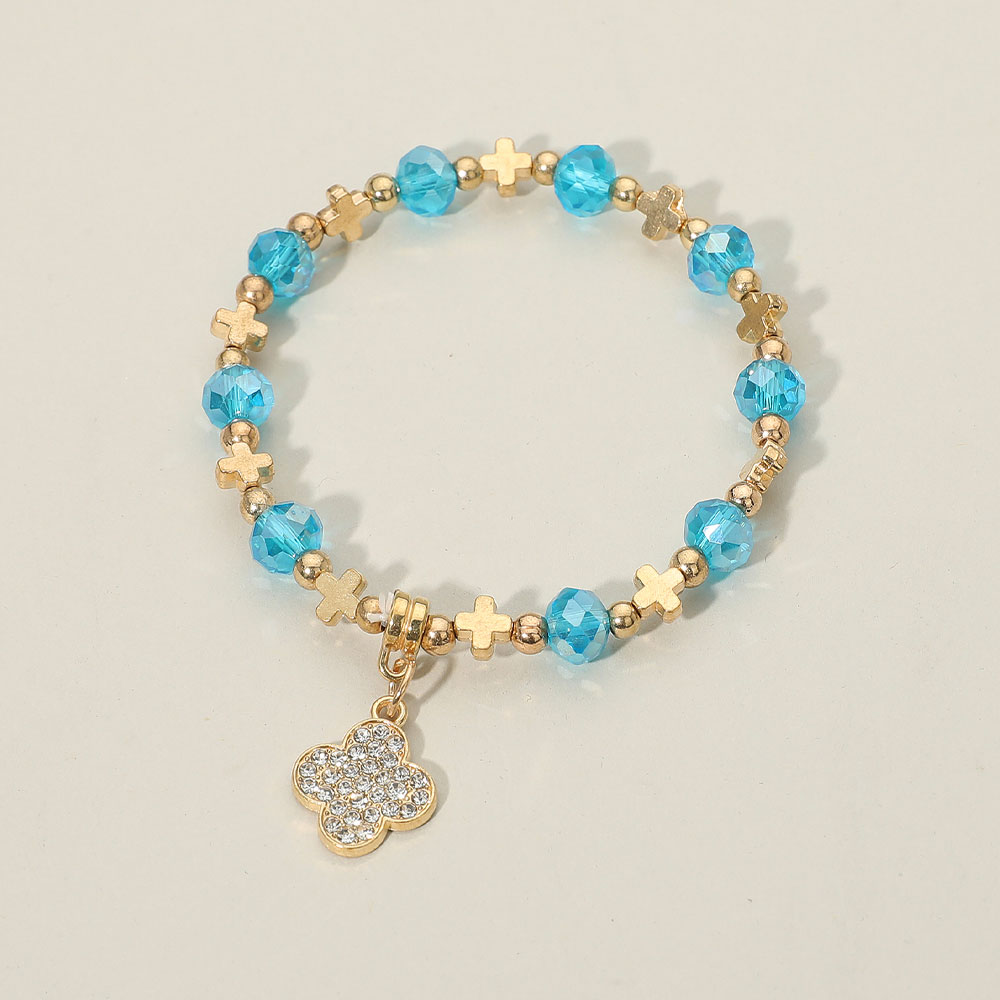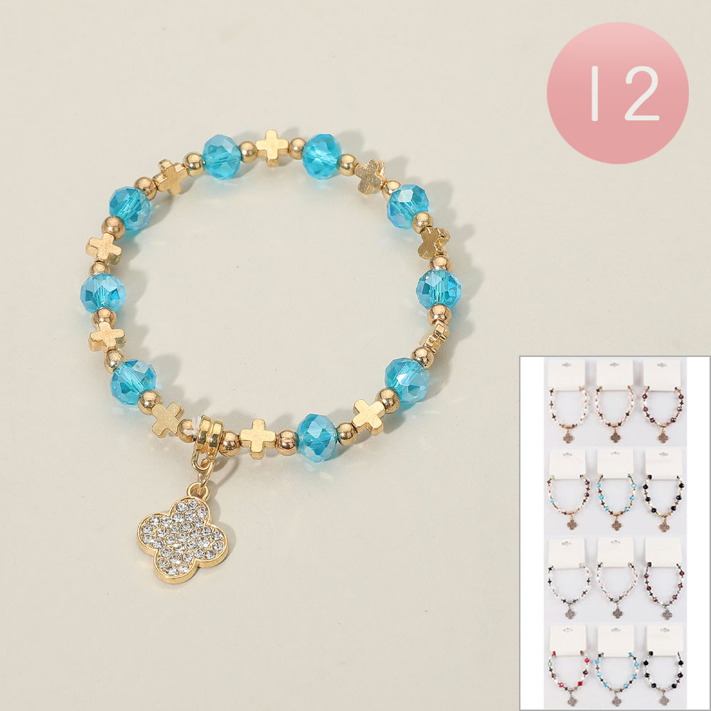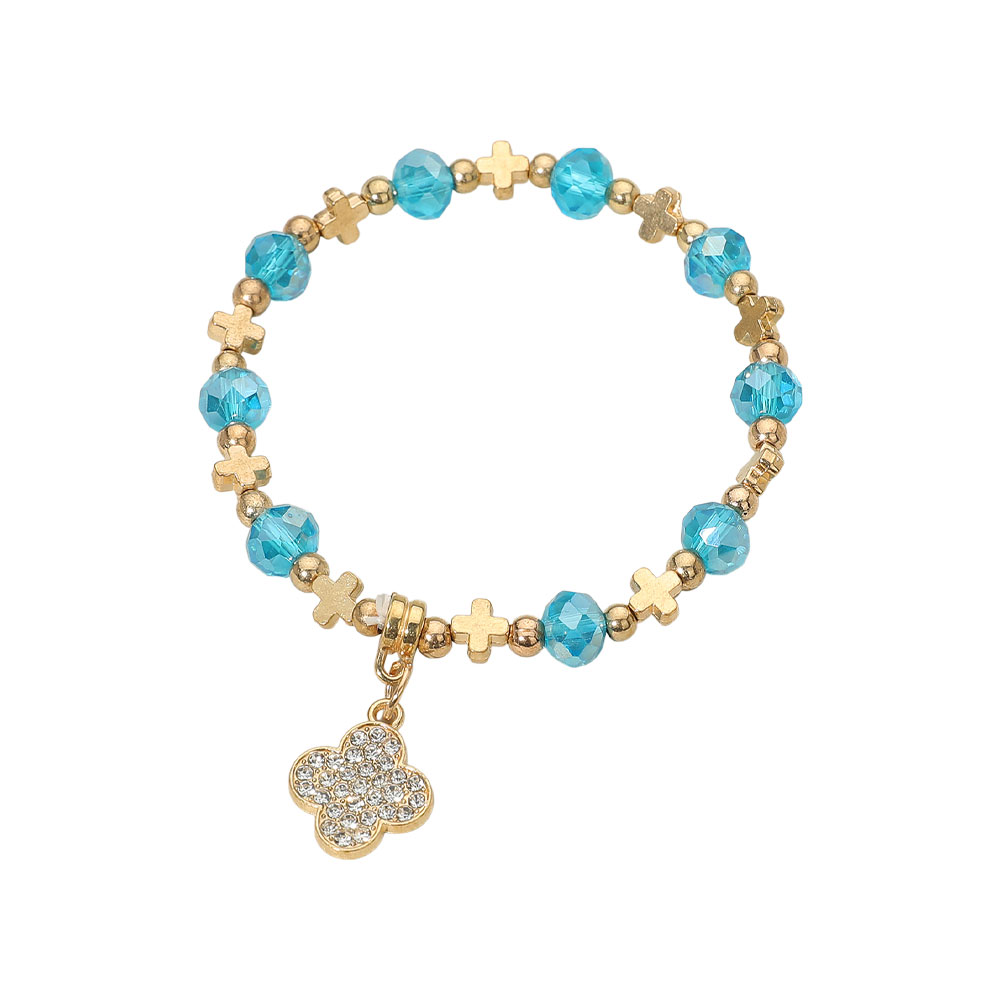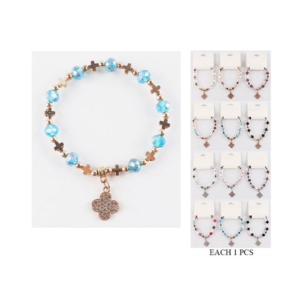 Details • Size : 0.3" H • Charm Size : 0.6" X 0.6" • Stretchable • This beaded stretch bracelet features a mix of faceted beads and mini cross accents, highlighted by a sparkling crystal quatrefoil charm. Designed for comfort and versatility, it adds a touch of elegance and shine to everyday wear, perfect for stacking or wearing as a standalone statement.