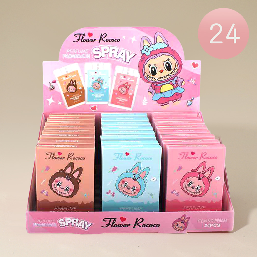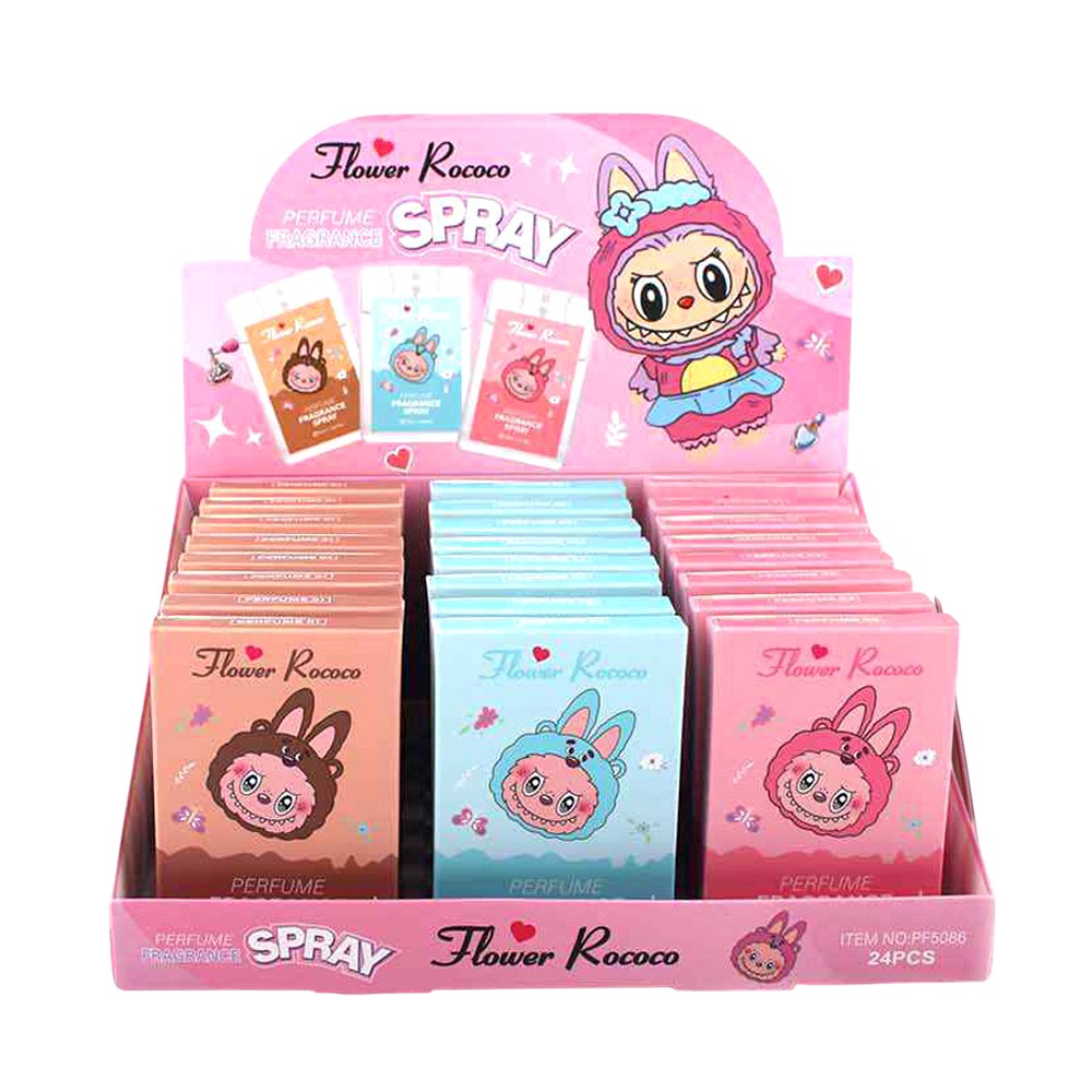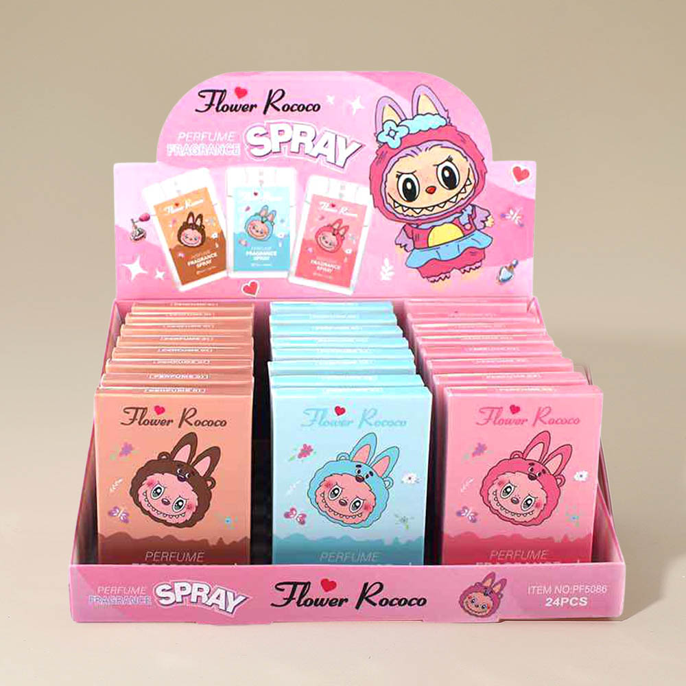 Details • Size : 20ml • Enjoy on-the-go freshness with this 24-piece assorted perfume spray set featuring slim, pocket-size bottles in fun character packaging. Perfect for daily use, travel, or gifting, each spray offers a refreshing fragrance. Ideal for party favors, retail display, or adding variety to your collection.