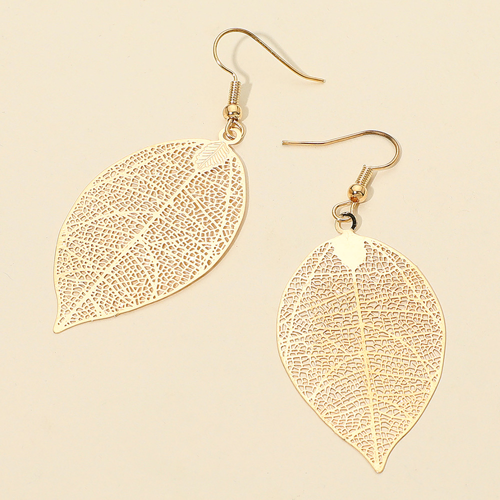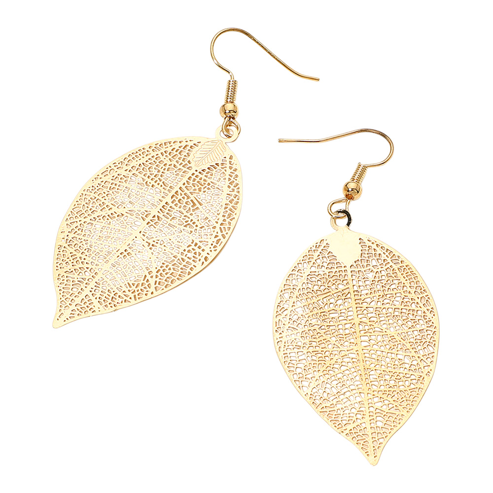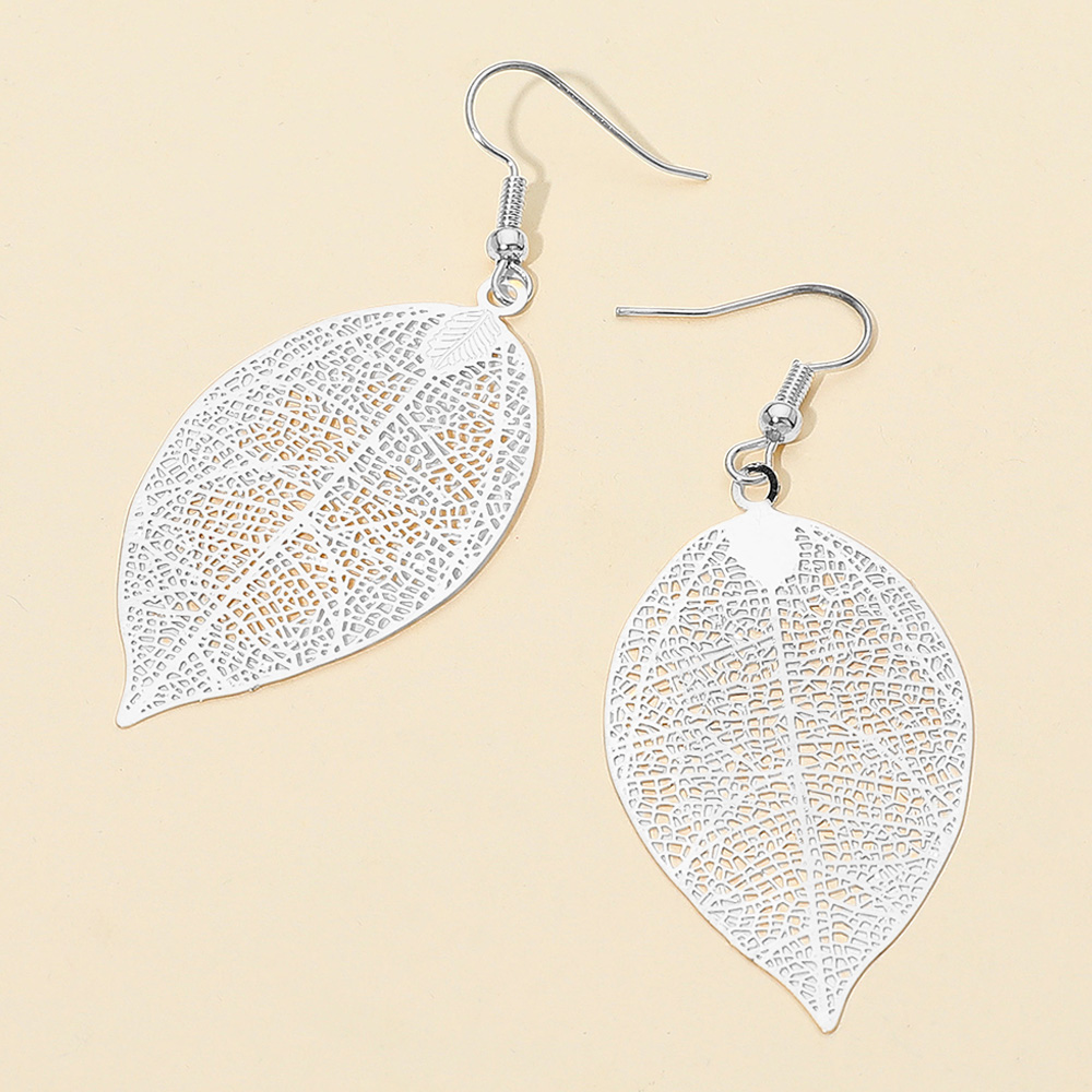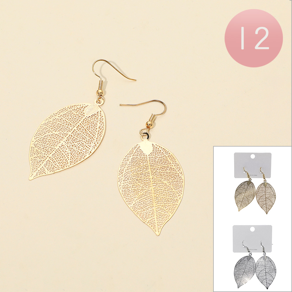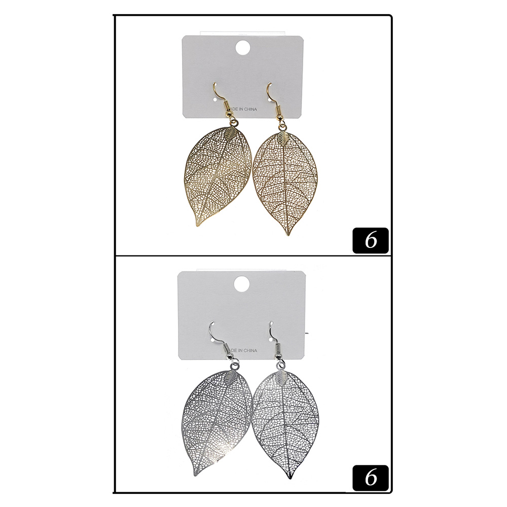 Details • Size : 1" X 2.25" • Fish Hook Back • Add elegance to your look with these leaf drop earrings, designed with a delicate cutout pattern. Lightweight and comfortable, they bring a natural yet stylish touch to casual outfits and dressy ensembles. A versatile accessory for everyday wear or special occasions.