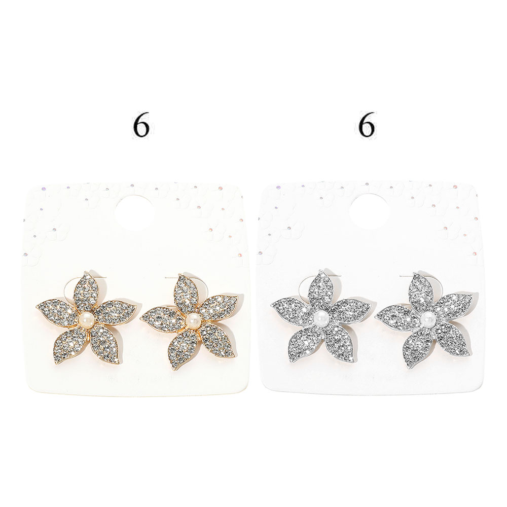 • Chic five-petal flower stud earrings adorned with shimmering crystals and a pearl center. Perfect for adding elegance to everyday or special occasion looks.