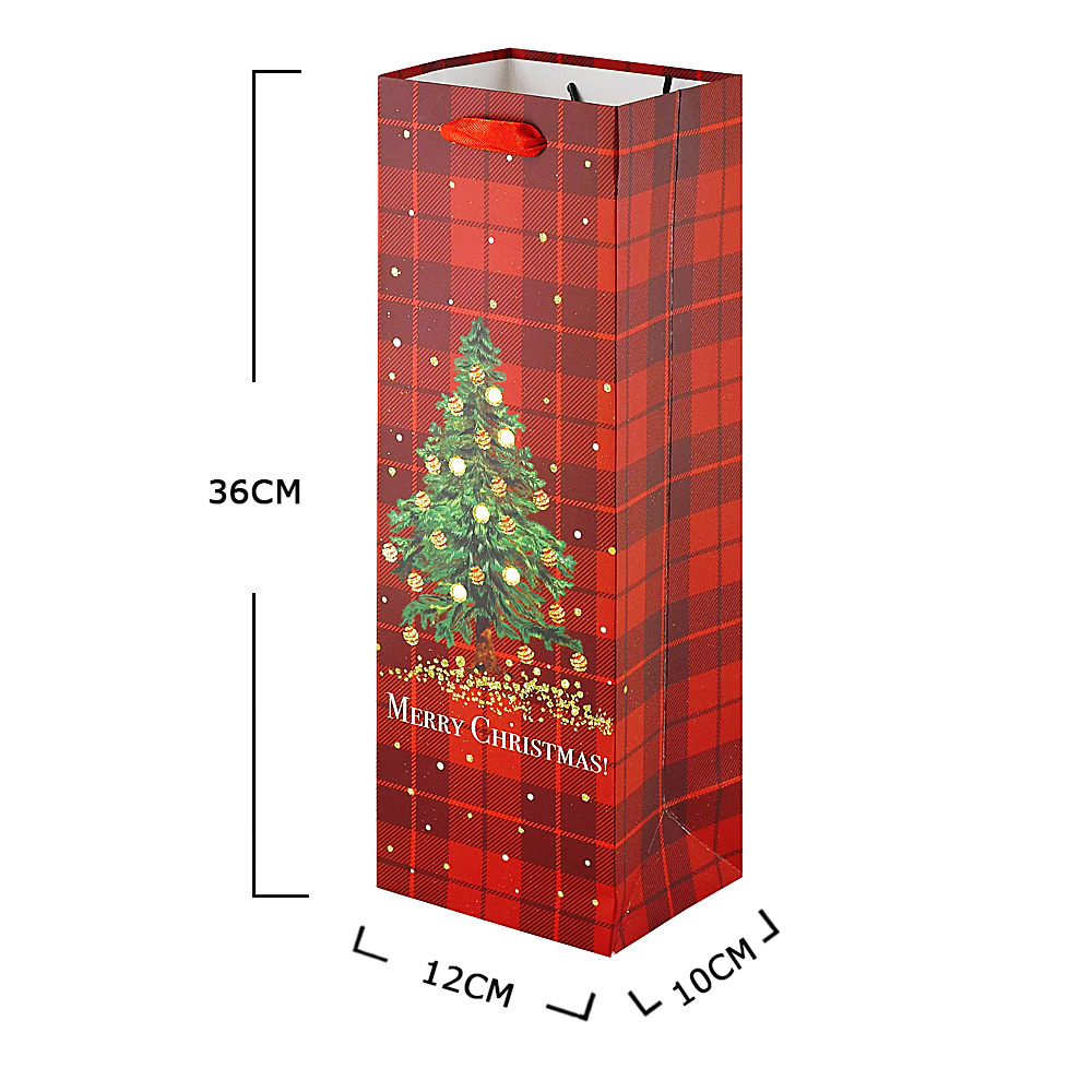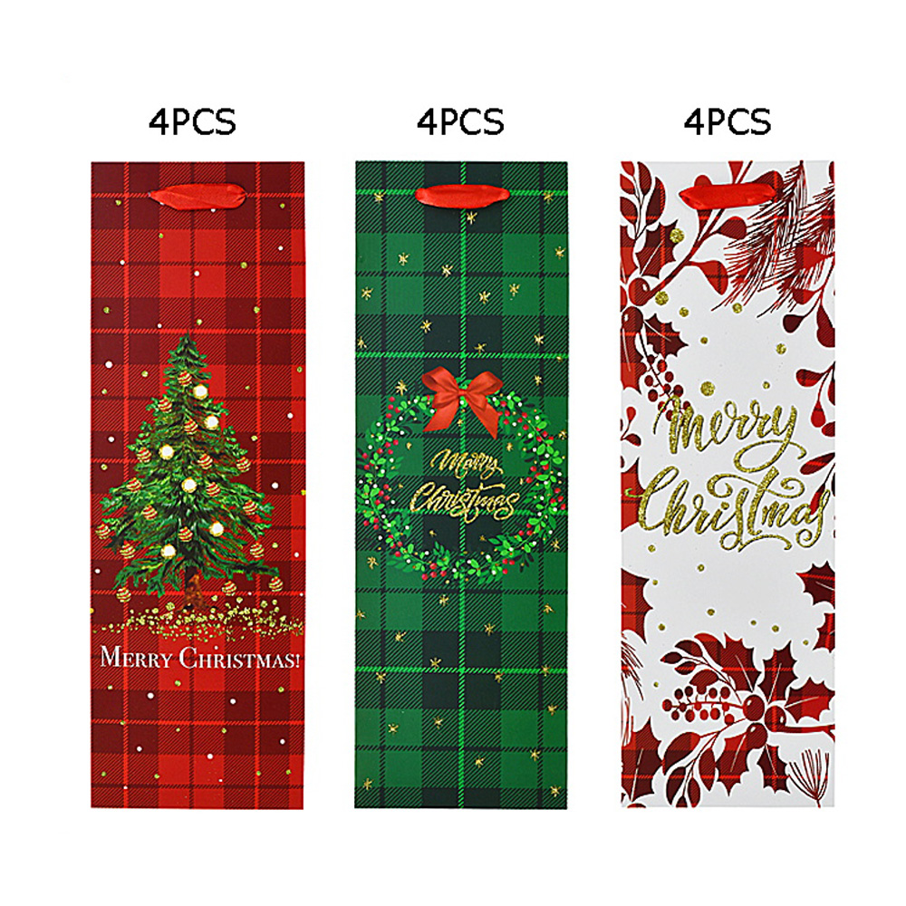 Details • Size : 4.75" X 14" X 3.75" • Top Handle Size : 3.75" L • Celebrate the season with these assorted Christmas wine gift bags featuring festive holiday patterns and sturdy ribbon handles. Perfect for gifting wine, champagne, or specialty drinks, these elegant bags add charm and holiday spirit to every celebration.