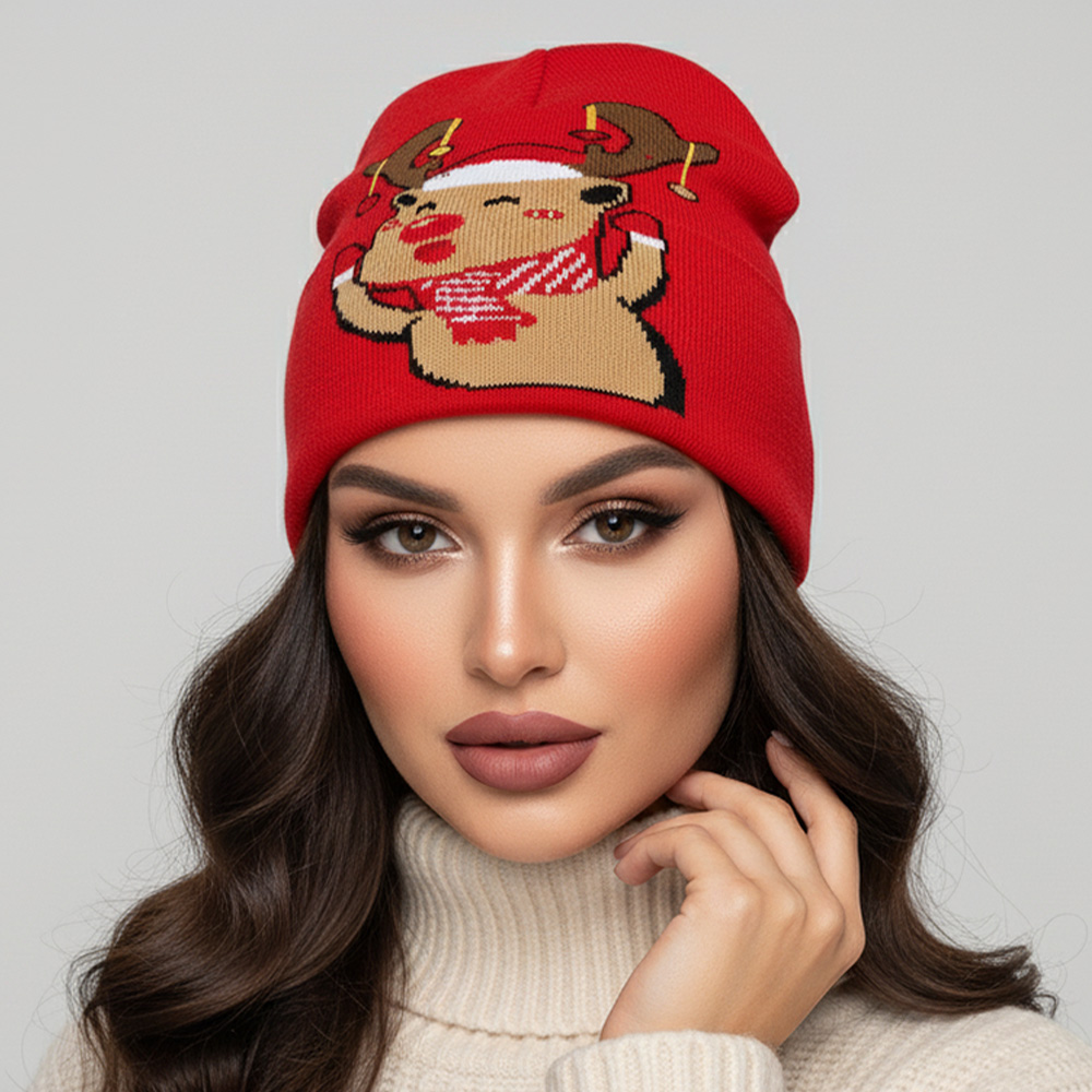 Details • Size : One Size • Material : 100% Acrylic • Spread holiday cheer with this Christmas knit beanie featuring a playful reindeer design. Perfect for winter festivities, parties, or gifting, this cozy hat combines seasonal charm with warmth and comfort, making it an essential accessory for the holiday season.