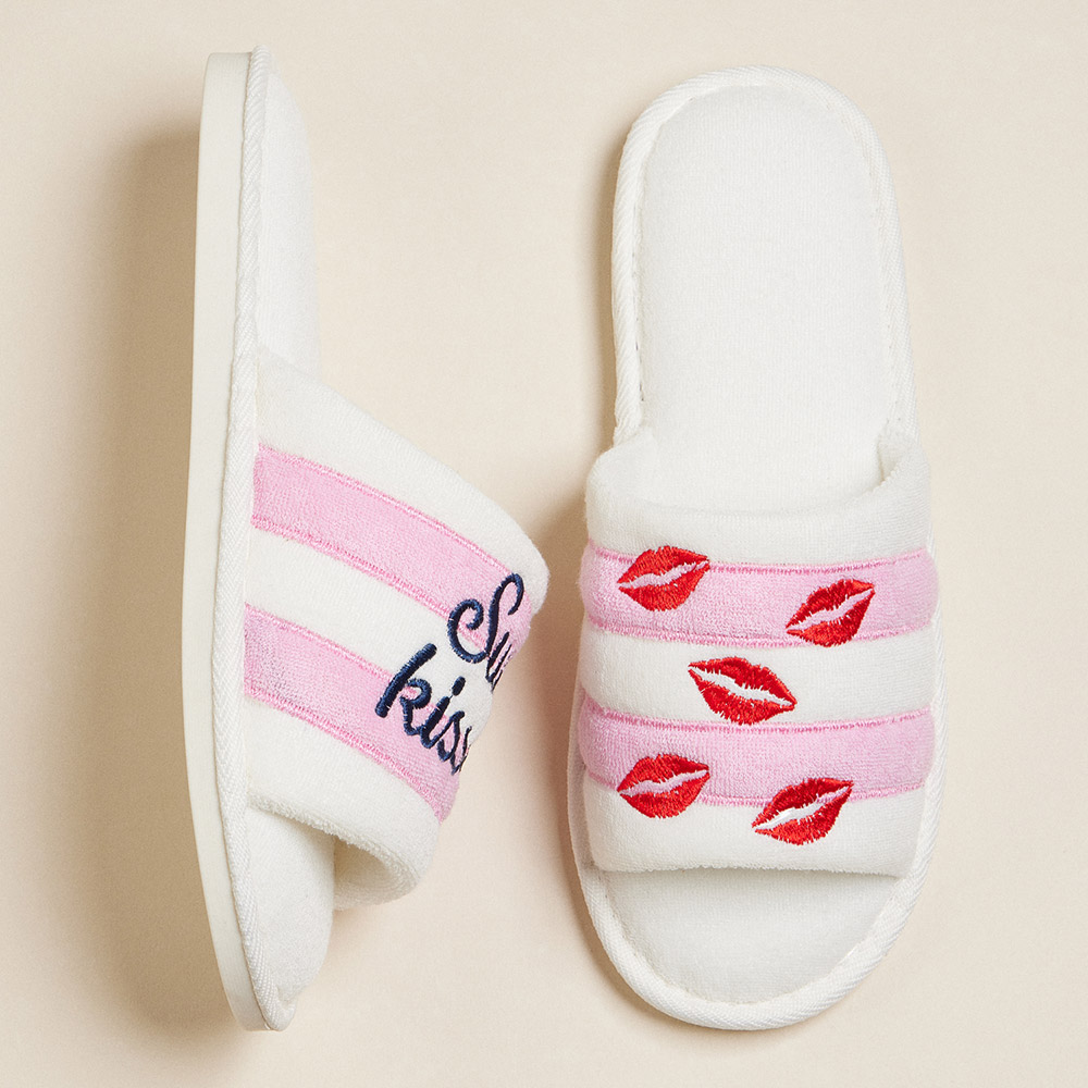 6Pairs - Kissy Lips Sun Kissed Message Embroidered Striped Pool Side Slippers / Home Indoor Floor Slippers