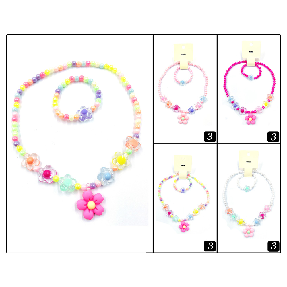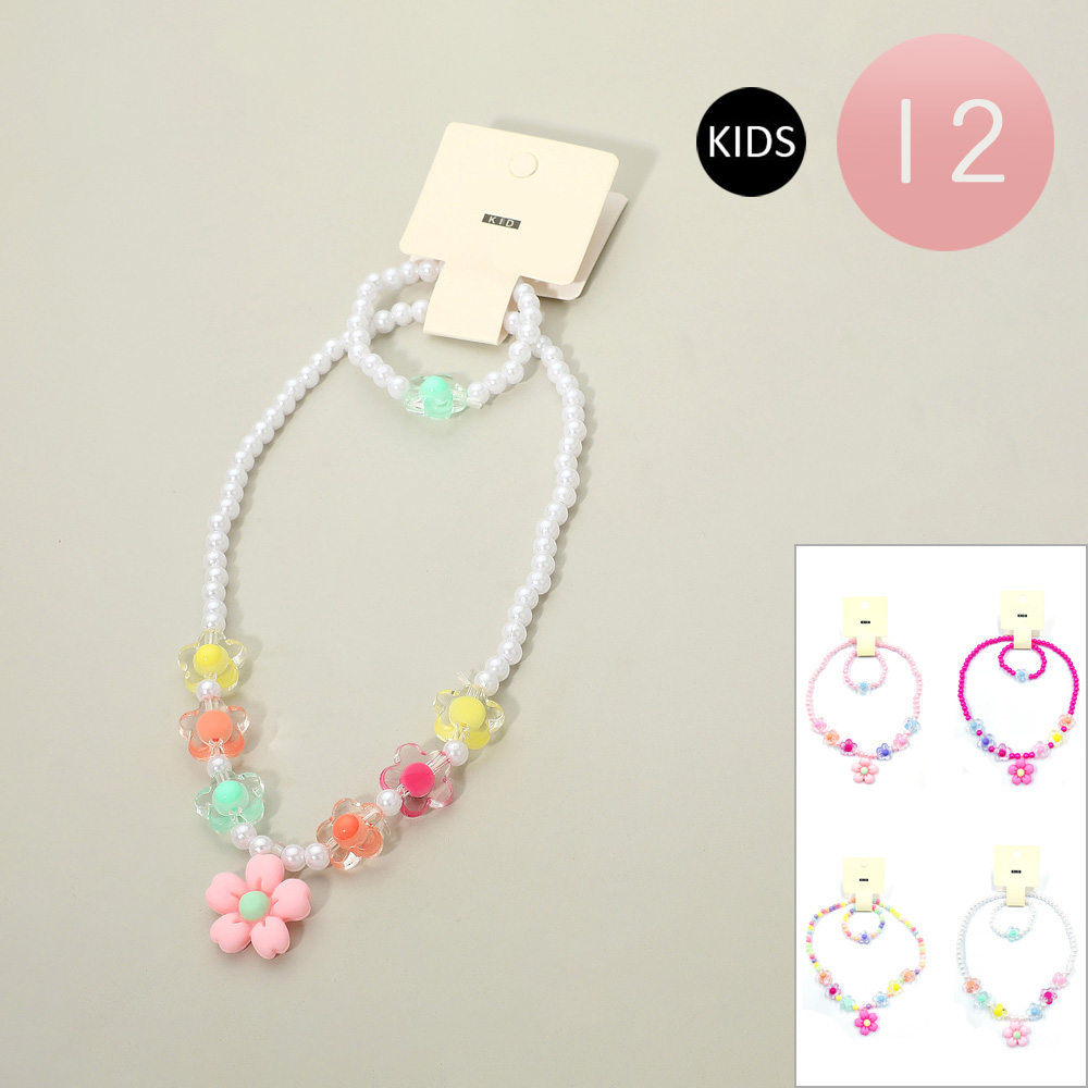 Details • Necklace Size : 15" L / Stretchable • Pendant Size : 1.2" L • Bracelet Size : 0.7" H / Stretchable • Adorable kids’ jewelry set featuring a cute flower charm on a beaded necklace with matching bracelet. Perfect for parties, birthdays, or everyday dress-up, this 12-piece pack adds playful style and fun to children’s outfits, making it a charming accessory choice for little ones.