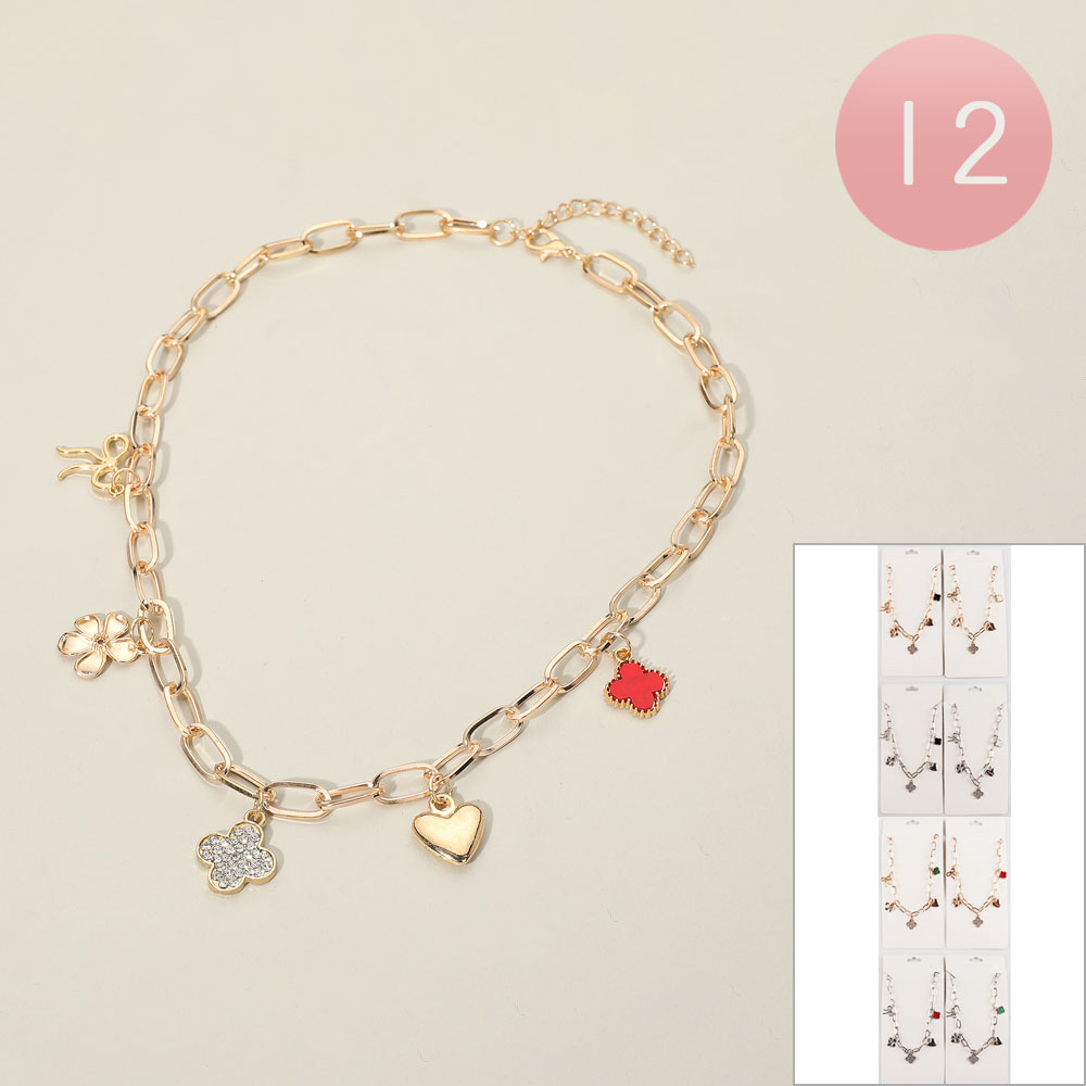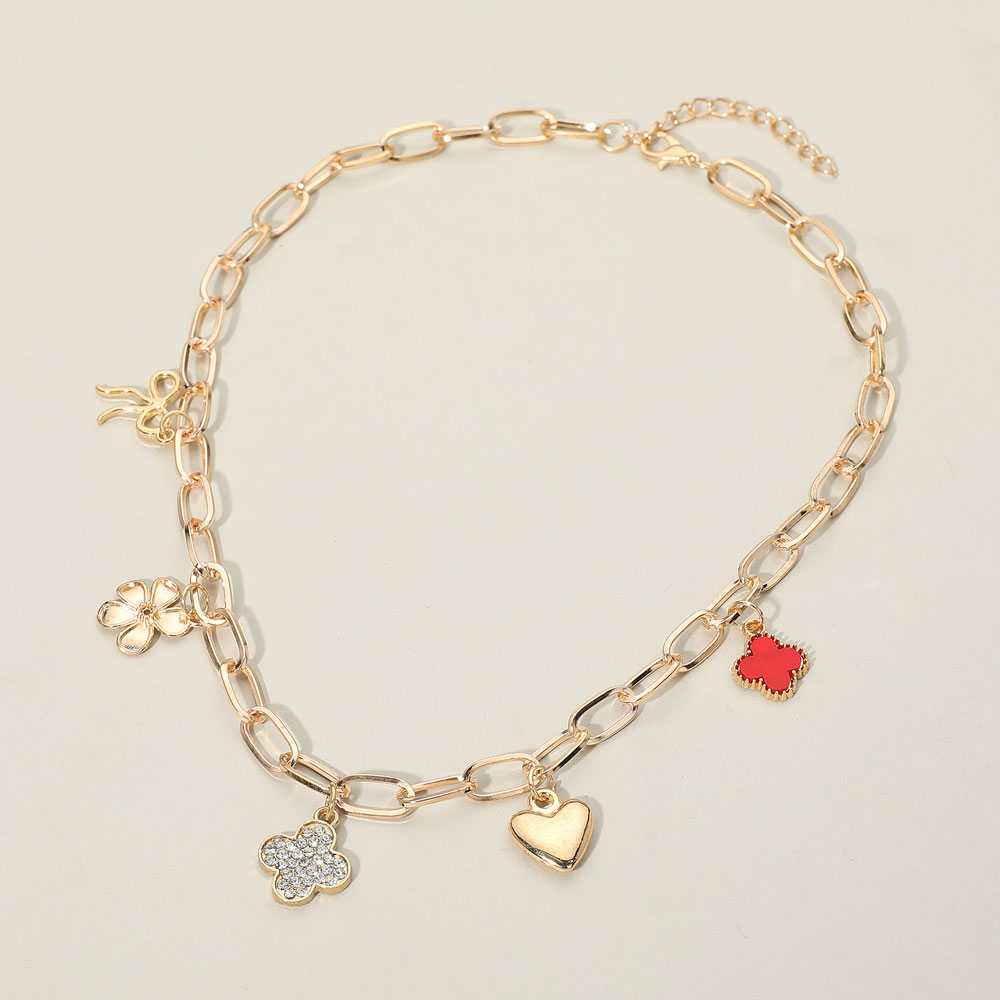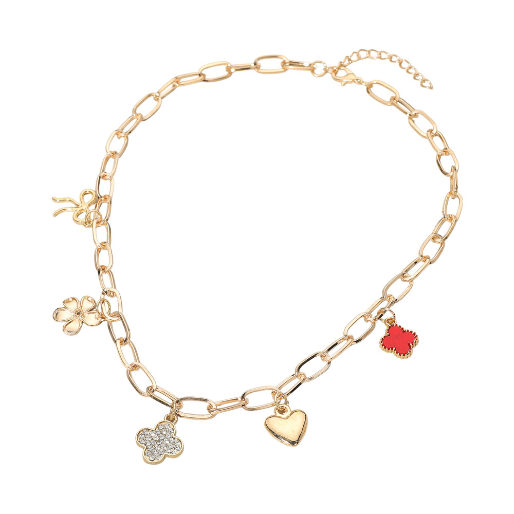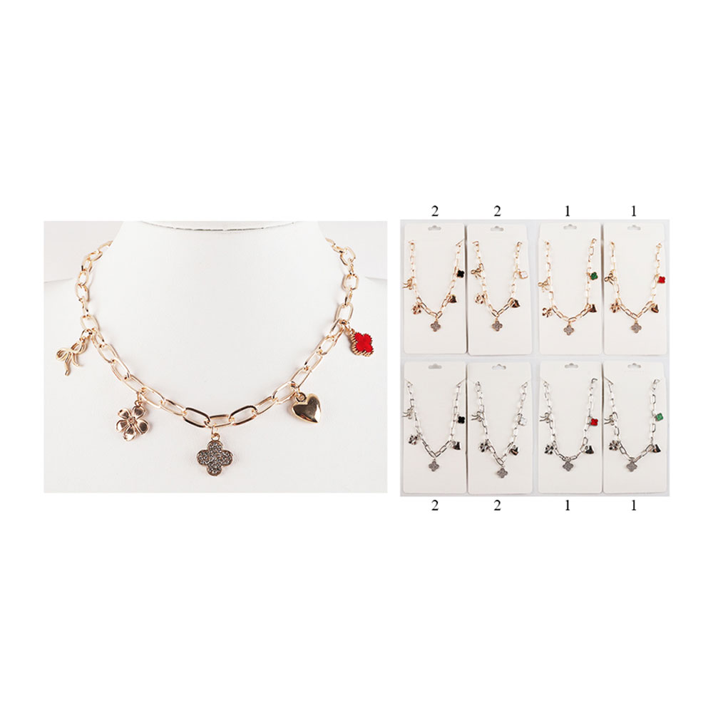 Details • Necklace Size : 16.5" + 2" L • Decor Size : 1" L • This elegant chain necklace showcases a collection of charming pendants including a heart, clover, and bow for a playful yet refined appeal. Designed with adjustable links for a customizable fit, it’s a versatile accessory that effortlessly enhances both casual and dressy looks.