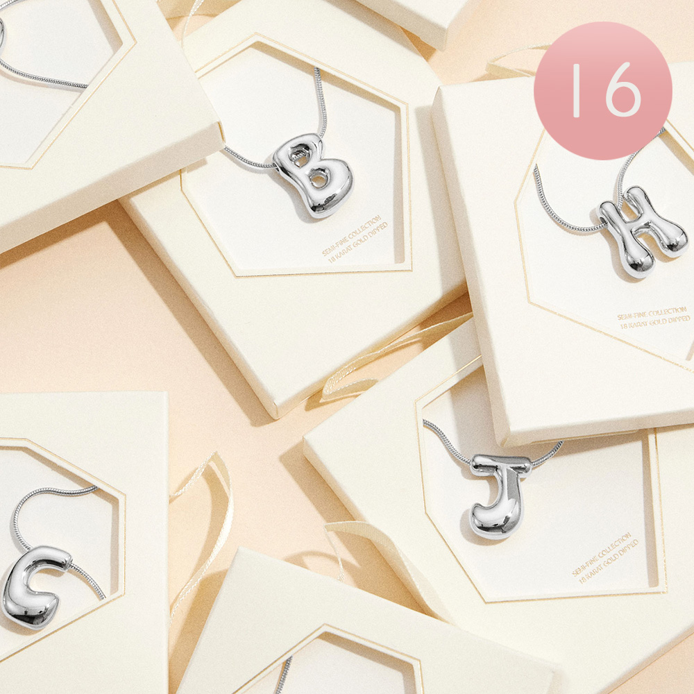 Details • Necklace Size : 16" + 2" L • Pendant Size : 0.75" L • 16 Letters (1PC EACH) - All White Gold Only • A, B, C, D, E, G, H, J, K, L, M, N, P, R, S, T • Stylish initial letter pendant necklaces presented in elegant gift boxes. A thoughtful personalized accessory perfect for everyday wear or as a meaningful gift for someone special. • Lead and Nickel Compliant • Made In Korea • Gold Dipped • Brass