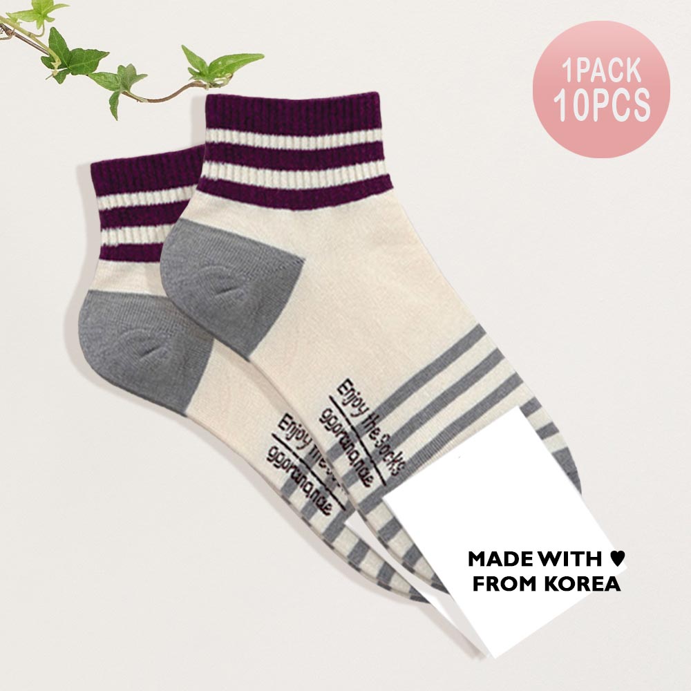 Details • Size : 9 - 11 • Material : Cotton, Spandex, Polyester, Polyurethane • Stay stylish and comfortable with this 10-pair pack of casual stripe ankle socks. Designed with a sporty touch and breathable stretch fit, these socks provide all-day comfort and durability, making them ideal for everyday wear, workouts, or relaxed weekend looks. • Made In Korea