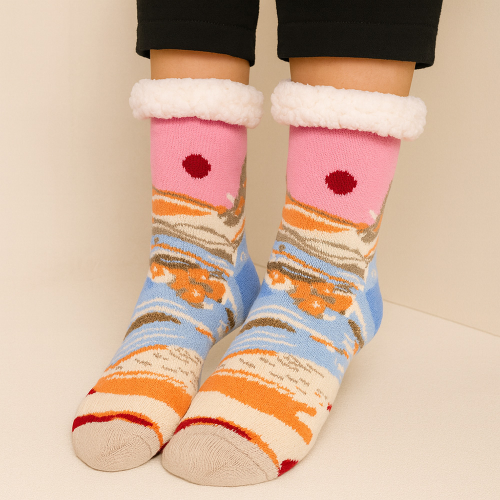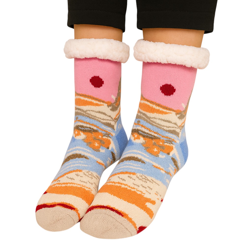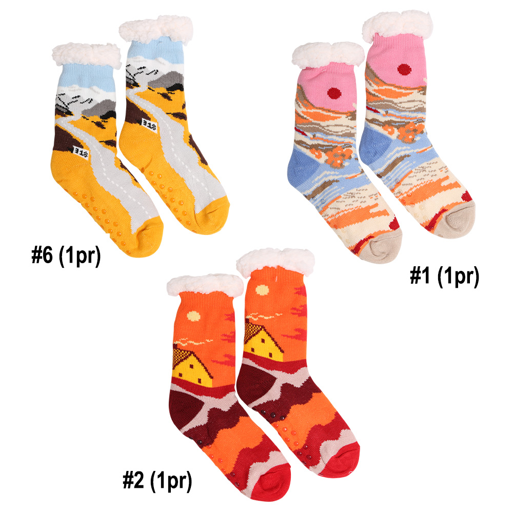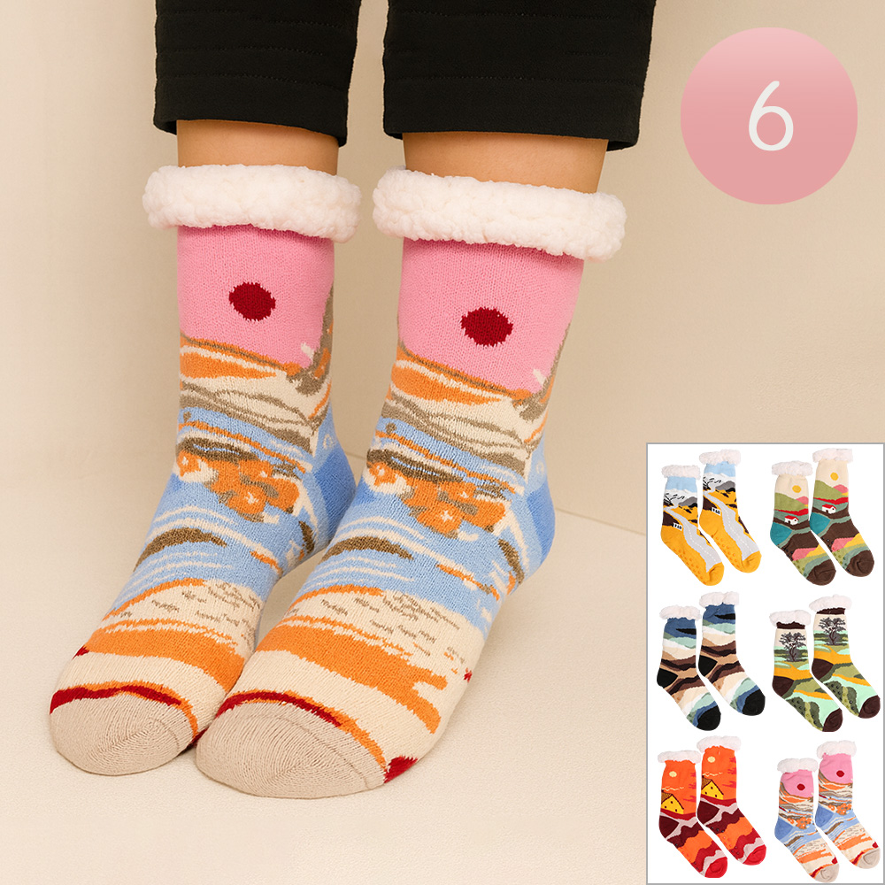 Details • Size : One Size • Material : 100% Polyester • Stay stylish and comfortable with this 6-pair pack of cozy socks featuring bold artistic patterns. Designed with soft lining for extra warmth, these socks are perfect for lounging, everyday wear, or as a fun gift. Add creativity and comfort to your wardrobe with these playful patterned socks.