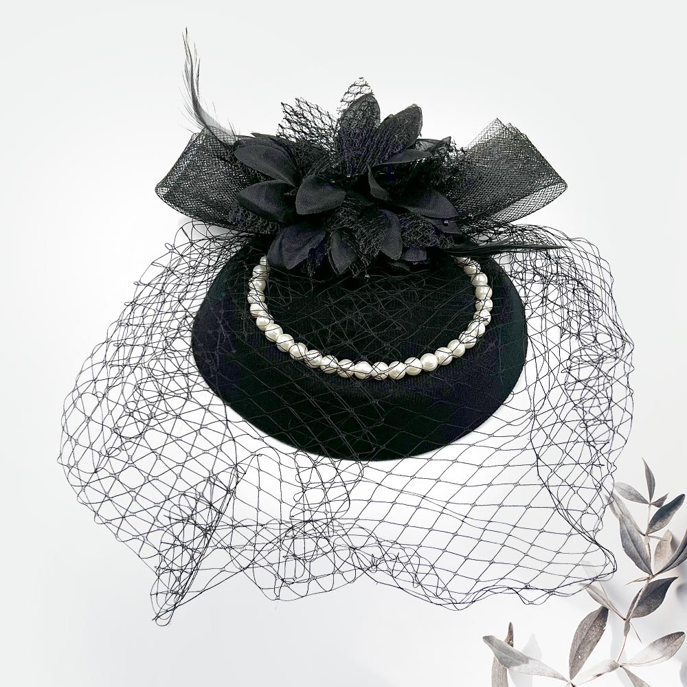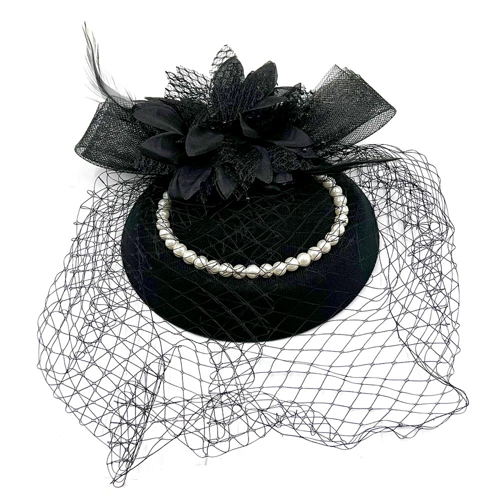 Details • Size : 8" X 10.5" • Dual : Hair Pinch Clip / Headband • Sophisticated fascinator hat featuring a delicate veil, floral embellishment, and pearl accent. Perfect for weddings, parties, or formal events, this stylish headpiece adds timeless elegance and charm to your look, making it a standout accessory for special occasions and fashionable gatherings.