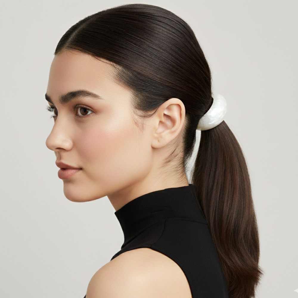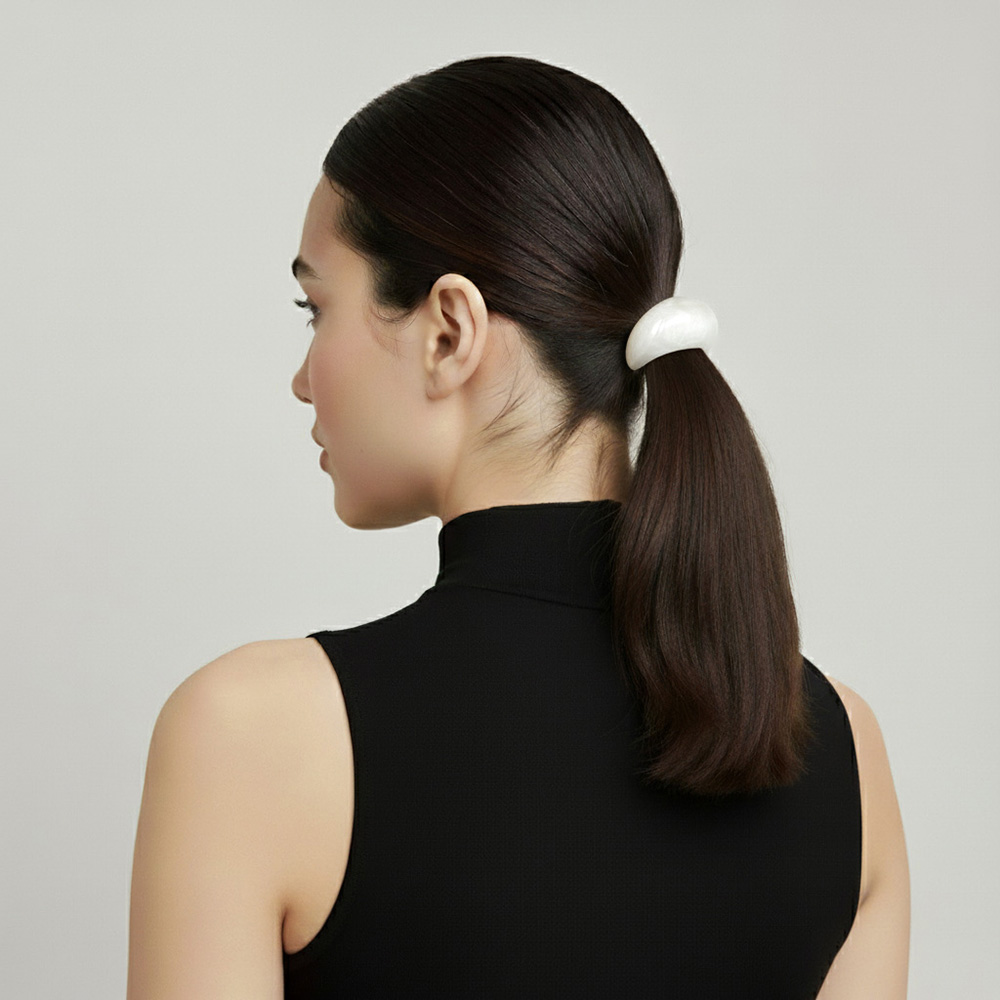 Details • Size : 0.75" H • Stretchable • Elevate your look with this curved resin accent hair tie, crafted with a sleek polished finish. The strong elastic band ensures a secure and comfortable hold, while the modern design adds a refined touch to ponytails, buns, and other everyday hairstyles.