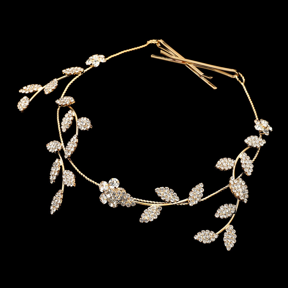 Details • Size : 11" X 15" • A Pair Bobbi Pin Included • This bridal gold crystal leaf hair vine adds elegant sparkle to any wedding hairstyle. Designed with shimmering blossoms and flexible detailing, it shapes easily around updos, braids, and romantic styles for a refined, timeless finish. • Lead and Nickel Compliant