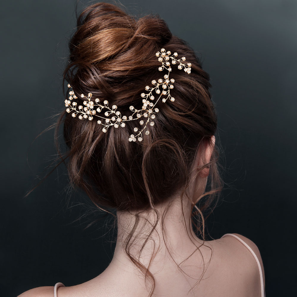 • This bridal hair vine features sparkling floral cz clusters and delicate crystal sprigs arranged along an elegant, cascading design. Flexible enough to shape around updos or half-up styles, it adds a romantic, refined touch perfect for weddings and formal occasions.