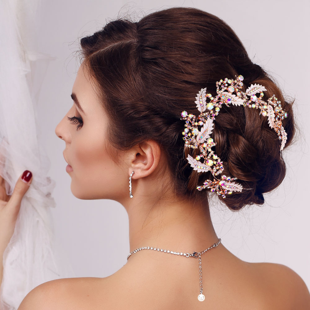 • Add a touch of sparkle with this circular bridal hairpiece featuring dazzling crystals, leaf details, and vine accents. Designed for elegant updos, it enhances wedding hairstyles with timeless beauty, making it perfect for brides, bridesmaids, and formal occasions.