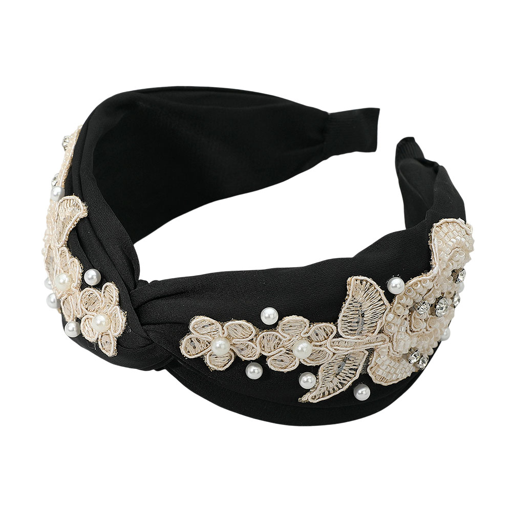 Details • Size : 3" H • This elegant headband features delicate floral embroidery accented with pearls and crystals, creating a refined and feminine look. Designed with a soft knotted style, it adds a touch of sophistication to any outfit—perfect for special occasions or everyday elegance.