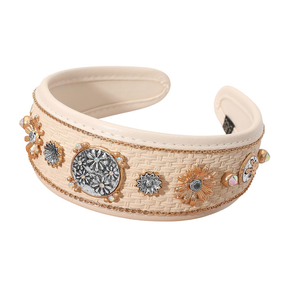 Details • Size : 2" H • Elegant woven headband featuring floral concho details with metallic and crystal-style accents. The intricate mix of gold and silver embellishments creates a refined western flair, making it a standout accessory for boho-chic or rustic-inspired looks.