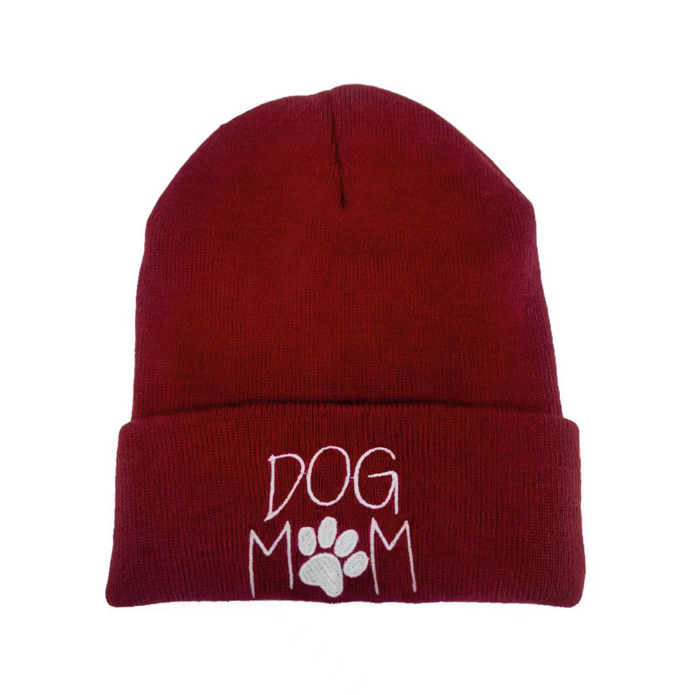 Dog Mom Message Paw Pointed Solid Knit Beanie Hat