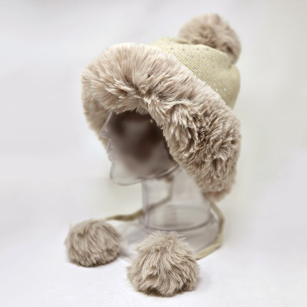 Rhinestone Embellished Faux Fur Ear Flap Pom Pom Winter Trapper Hat