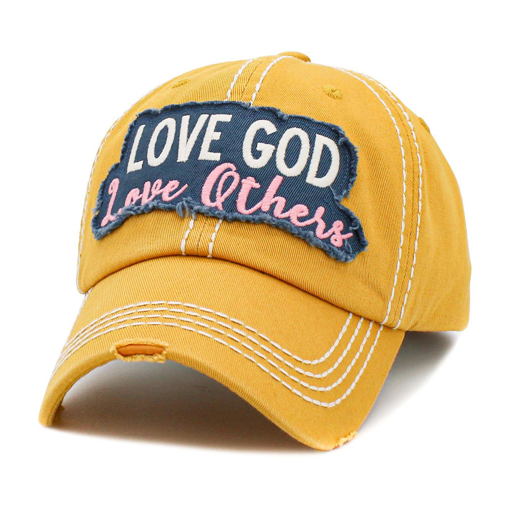 Details • Crown Circumference : 23" (Adjustable) • Crown Height : 4.5" • Brim Height : 3" • Material : 100% Cotton • Show faith and kindness with this distressed baseball cap featuring the inspirational phrase “Love God Love Others.” Stylish with contrast stitching and a comfortable fit, it’s the perfect everyday accessory to spread positivity and encouragement.