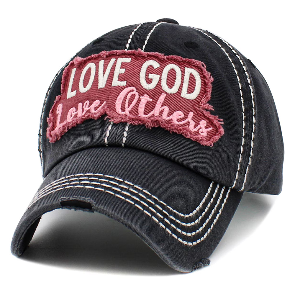 Details • Crown Circumference : 23" (Adjustable) • Crown Height : 4.5" • Brim Height : 3" • Material : 100% Cotton • Show faith and kindness with this distressed baseball cap featuring the inspirational phrase “Love God Love Others.” Stylish with contrast stitching and a comfortable fit, it’s the perfect everyday accessory to spread positivity and encouragement.