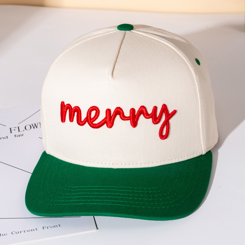 Details • Size : One Size Fits All - Adjustable Strap Makes Fit Comfortable • 5 Panel Canvas Cap : Adjustable Buckle Closure, Relaxed Fit and Pre-Curved Visor • Add cheerful holiday spirit to your look with the Merry baseball cap, designed with bold embroidered lettering and a festive vibe. Perfect for casual wear, seasonal parties, or gifting, this cap makes a fun statement and spreads joy all season long.