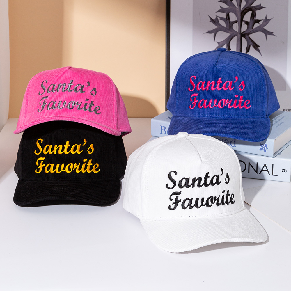 Details • Size : One Size Fits All - Adjustable Strap Makes Fit Comfortable • 5 Panel Canvas Cap : Adjustable Buckle Closure, Relaxed Fit and Pre-Curved Visor • This Corduroy K-Frame 5 Panel Hat is a must-have addition to any hat collection. Made with high-quality corduroy, this 5 panel hat has a sophisticated and stylish look. The sturdy material provides both durability and comfort, making it perfect for everyday wear. Upgrade your headwear game with this classic and versatile corduroy baseball hat. • Fun holiday cap embroidered with the playful phrase “Santa’s Favorite.” A festive accessory for Christmas parties, family gatherings, or seasonal outfits. Adjustable fit makes it comfortable for all-day wear and a perfect novelty gift to spread cheer and show holiday spirit in a bold, fun way.