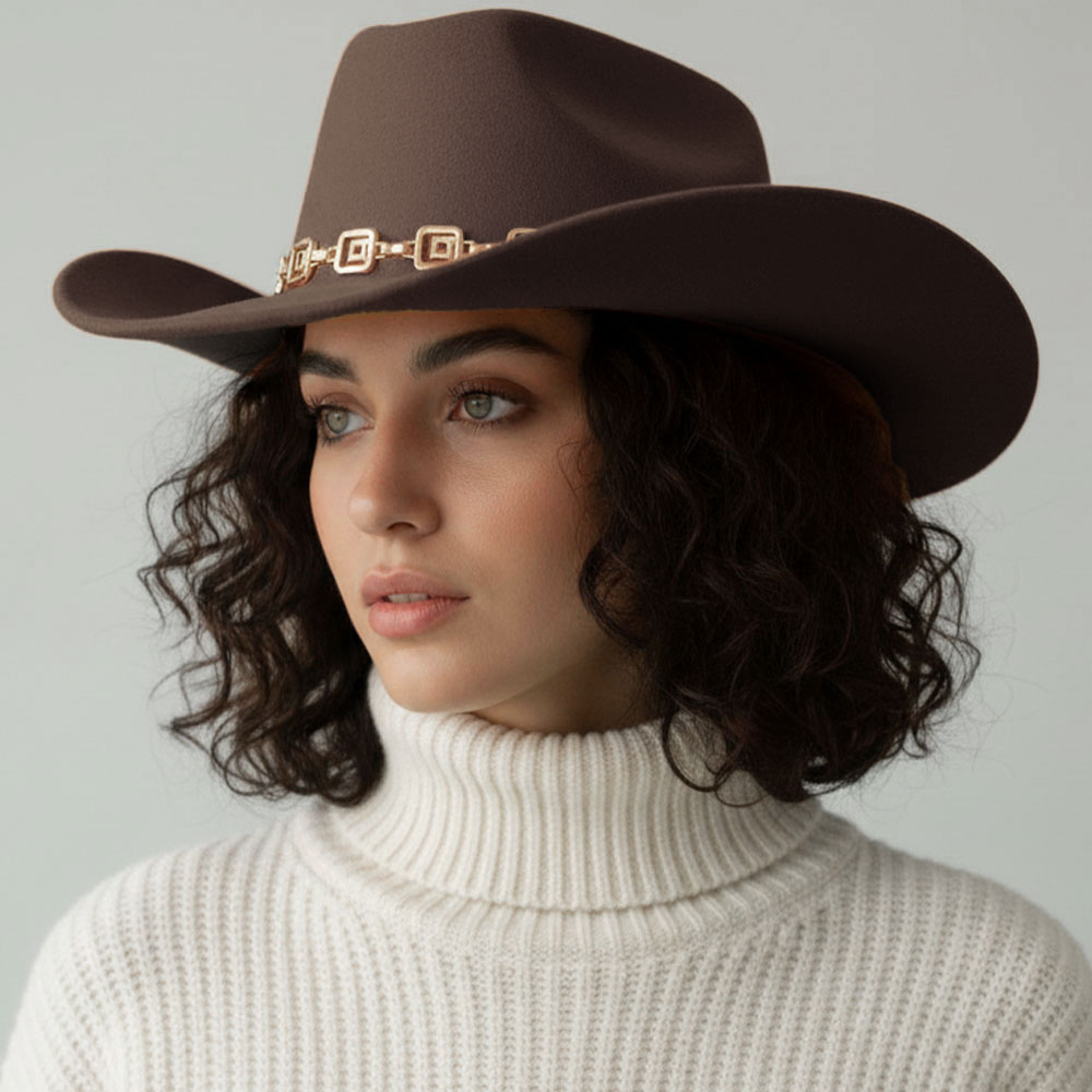 Details • Crown Circumference: 23" • Crown Height : 4.75" • Brim Width : 3.25" • Material : 100% Polyester • Make a refined statement with this Western-inspired hat featuring a bold curved brim and a geometric chain detail that adds modern edge. Designed to complement both elevated and casual looks, it offers a distinctive silhouette that brings effortless sophistication to any wardrobe.