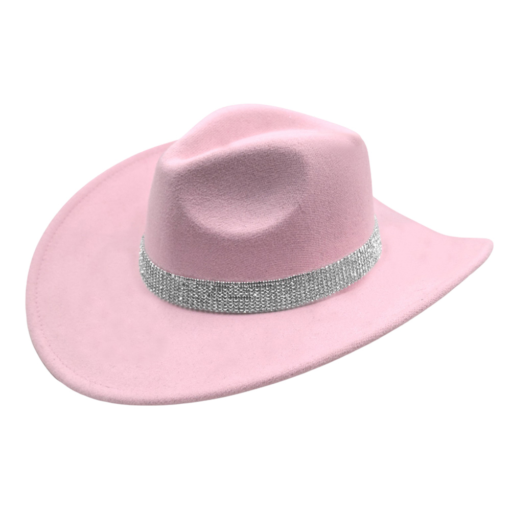 Details • Crown Circumference : 23" • Crown Height : 4.75" • Brim Height : 3.5" • Material : 100% Polyester • Make a striking impression with this wide-brim statement cowboy fedora hat featuring a glimmering crystal band. Designed for timeless elegance and modern sophistication, it adds a touch of glamour to any outfit—perfect for upscale events, travel, or fashionable daywear.