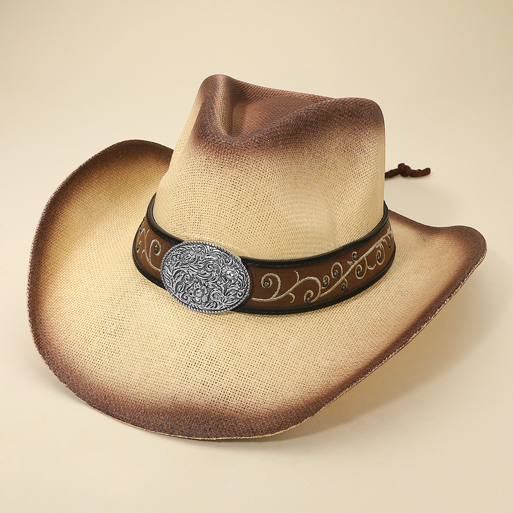 Details • Crown Circumference : 23" • Crown Height : 4.75" • Brim Height : 3.75" • Material : 98% Rayon, 2% Polyester • Capture authentic western style with this cowboy hat featuring a tooled band and ornate silver concho. Perfect for rodeos, concerts, or casual outings, it blends rugged tradition with refined details, making it a versatile accessory for any cowboy-inspired look.
