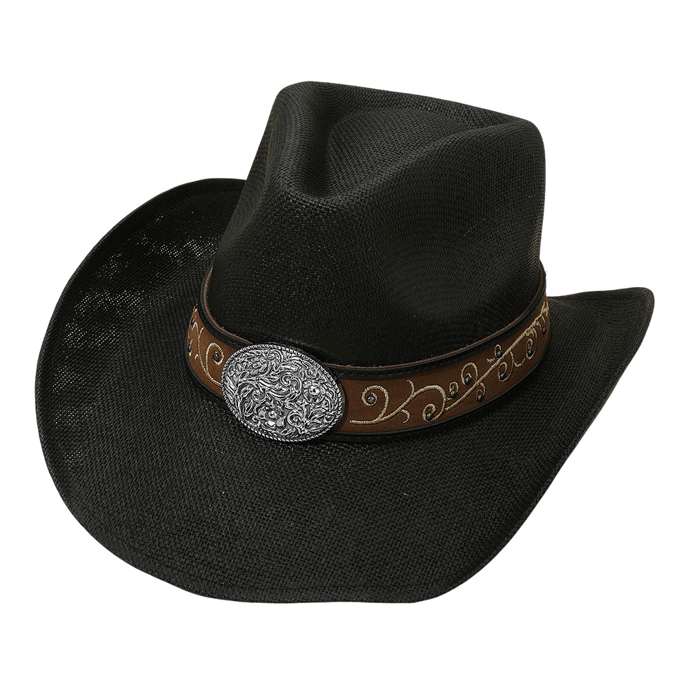 Details • Crown Circumference : 23" • Crown Height : 4.75" • Brim Height : 3.75" • Material : 98% Rayon, 2% Polyester • Capture authentic western style with this cowboy hat featuring a tooled band and ornate silver concho. Perfect for rodeos, concerts, or casual outings, it blends rugged tradition with refined details, making it a versatile accessory for any cowboy-inspired look.