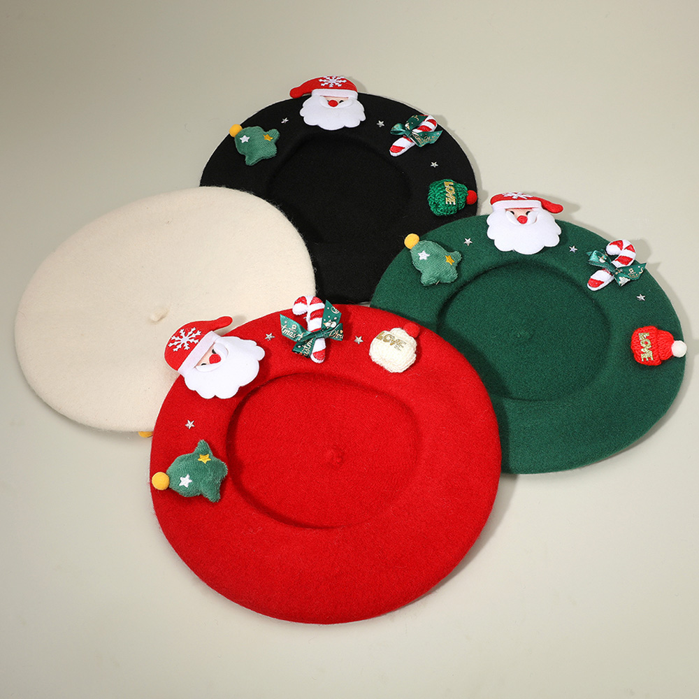 • Festive Christmas beret hat featuring a cheerful Santa design, candy cane, and holiday-themed details. A playful accessory perfect for parties, gatherings, and seasonal outfits. Add charm and holiday cheer to your winter look with this fun Christmas hat, ideal for gifting or festive celebrations.