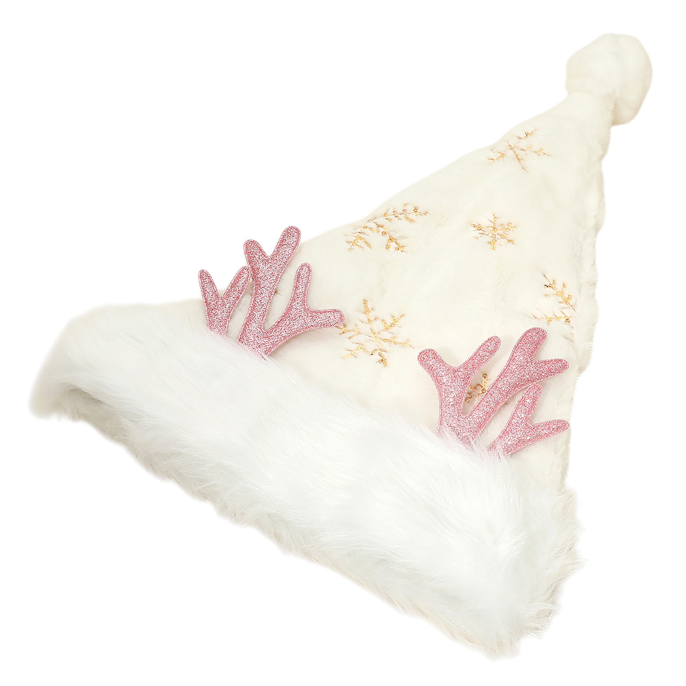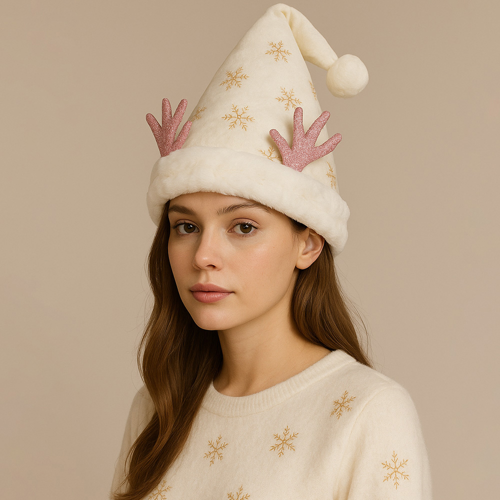 Fluffy Christmas Antler Accent Sequin Snowflake Pattern Santa Hat