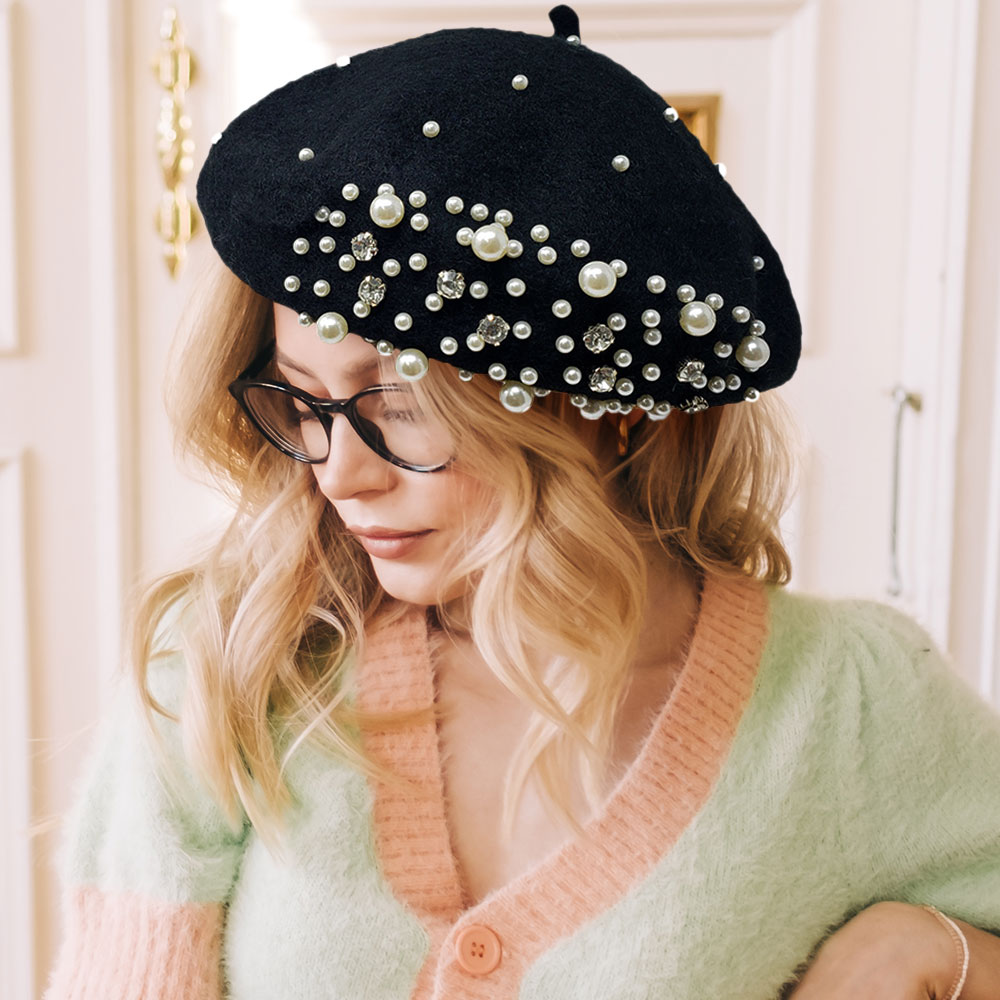 Details • Size : One Size • Material : 80% Wool, 20% Acrylic • Chic beret hat adorned with pearl embellishments for a stylish and elegant look. Perfect for elevating seasonal outfits, this accessory adds a touch of sophistication and charm, making it a fashionable addition to both casual and dressy wardrobes.