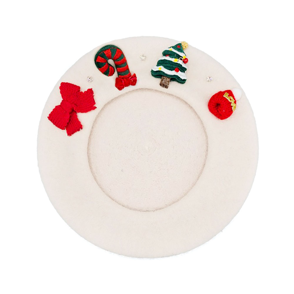 Details • Size : 10.5" X 10.5" • Material : Wool Blended • Cozy wool-blend beret decorated with charming Christmas details including a tree, candy cane, bow, and festive accents. A stylish holiday accessory that adds seasonal cheer to any winter outfit.