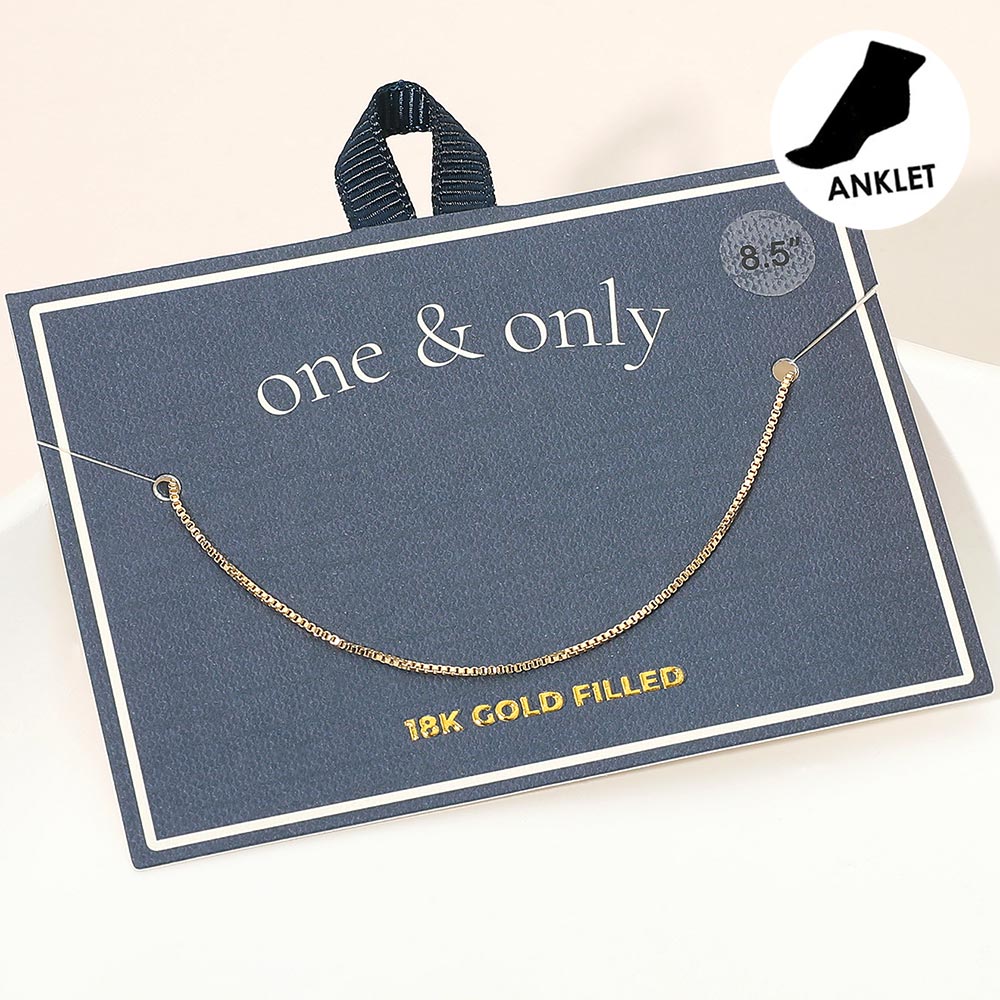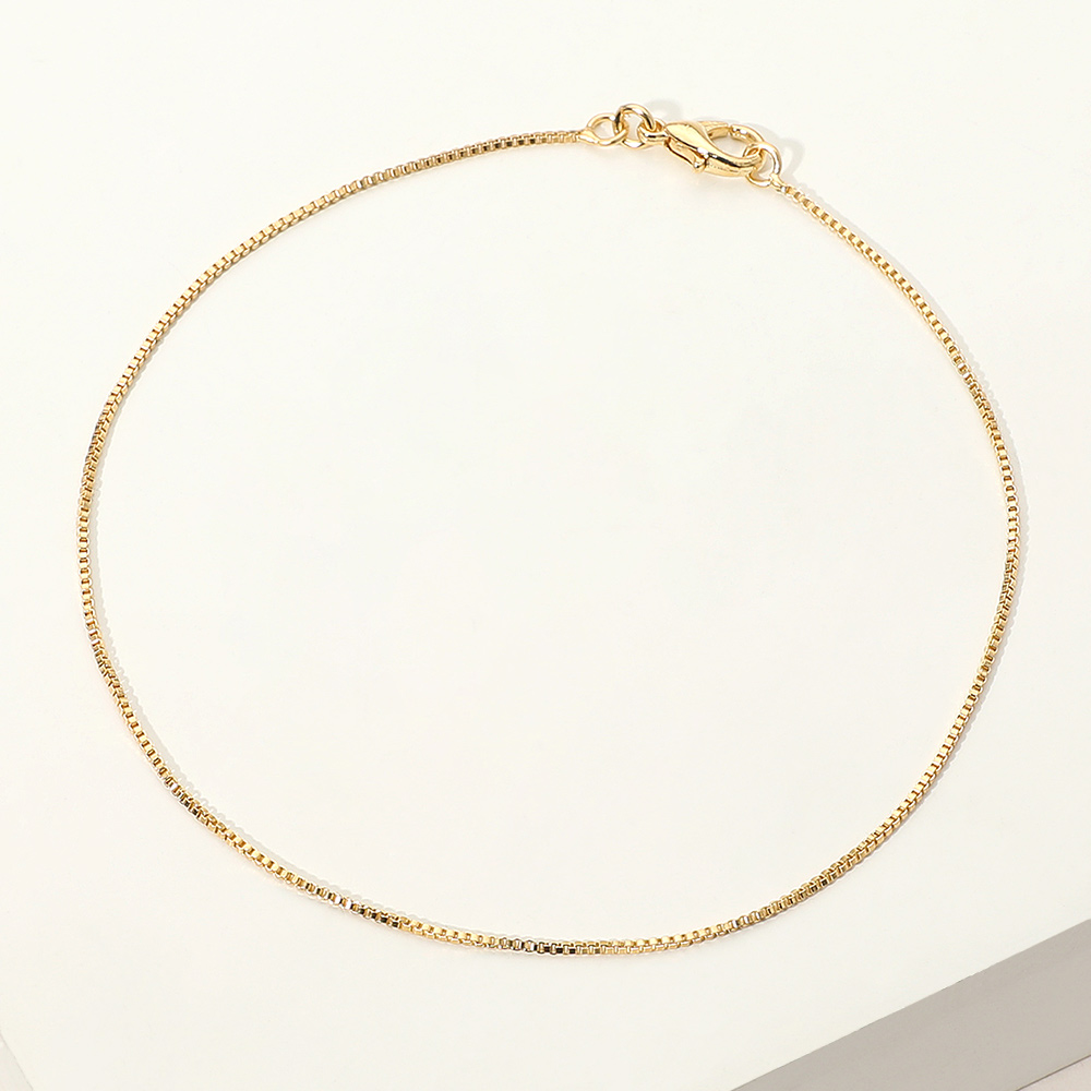 Details • Size : 0.1" H, 8.5" L • Lobster Clasp Closure • Chic box chain anklet with a smooth, polished finish for a refined and timeless look. Perfect for layering or wearing solo, this elegant design adds a subtle shimmer and touch of sophistication to your everyday and dressy outfits. • Lead and Nickel Compliant • Gold Filled • Made In Brazil