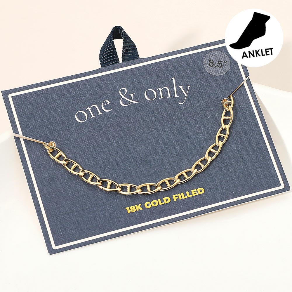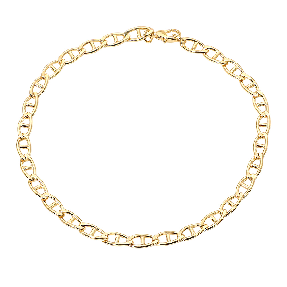 Details • Size : 0.25" H (4mm), 8.5" L • Lobster Clasp Closure • Timeless anklet featuring a classic mariner link chain that exudes effortless elegance. Crafted with an 18K gold-filled finish, this sleek and durable design adds a refined touch to everyday wear—perfect for layering or as a subtle statement of sophistication. • Gold Filled • Lead and Nickel Compliant • Made In Brazil