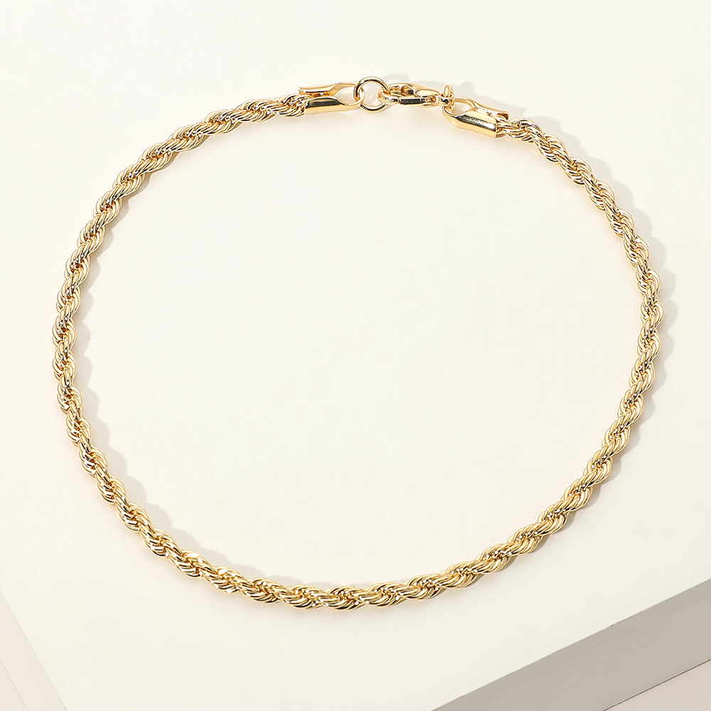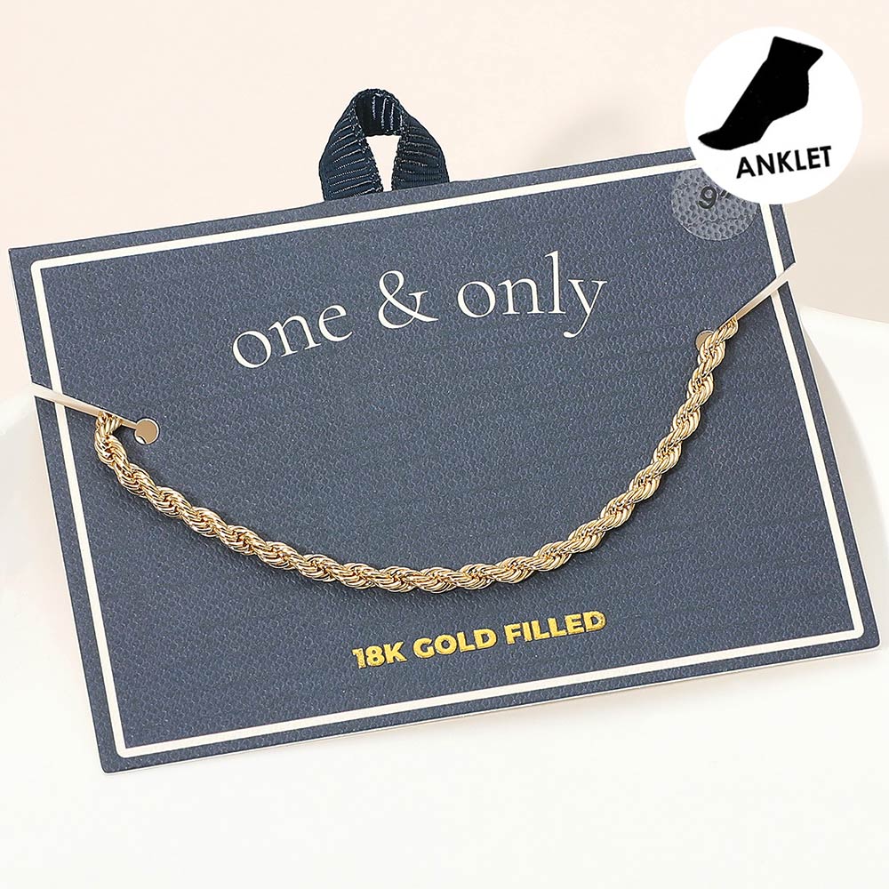 Details • Size : 0.1" H (3mm), 9" L • Lobster Clasp Closure • Elegant twisted rope chain anklet featuring a polished braided design that adds timeless shine and texture. Perfect for both casual and dressy looks, this anklet brings a touch of sophistication and effortless style to your everyday accessories collection. • Gold Filled • Lead and Nickel Compliant • Made In Brazil