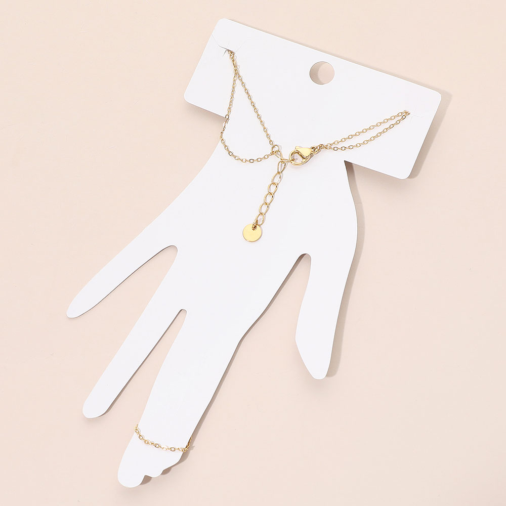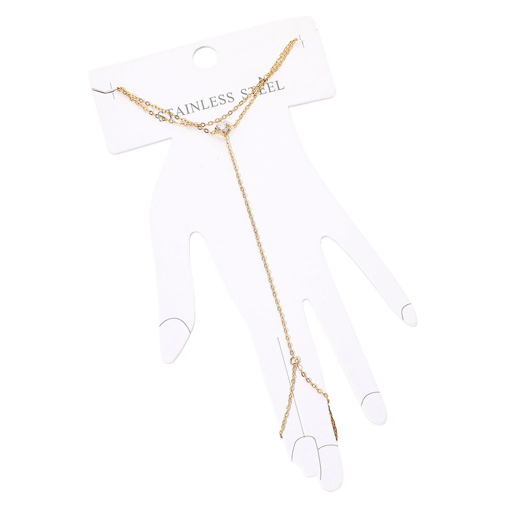 Details • Size : 3.25" H, 6.5" + 1" L • Ring Size : Free • Elegant hand chain bracelet connecting wrist to finger with a delicate, streamlined silhouette and subtle crystal accent for refined shine. Designed for modern layering or standalone wear, this graceful piece elevates everyday style and transitions beautifully into evening looks with effortless sophistication. • Stainless Steel
