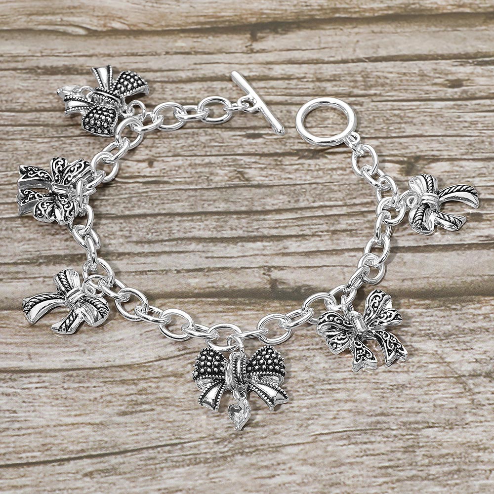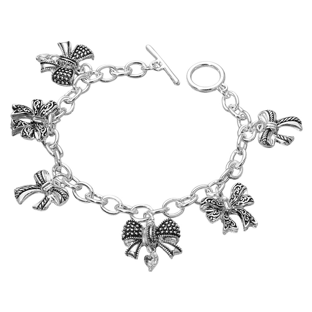 Details • Size : 0.25" H, 8" + 0.75" L • Toggle Closure • Add charm and style to your look with this bow charm bracelet featuring detailed ribbon pendants. The chain link design with multiple bow accents offers a playful yet elegant touch, making it a perfect accessory for daily wear or special occasions, ideal for gifting or personal style. • Lead and Nickel Compliant